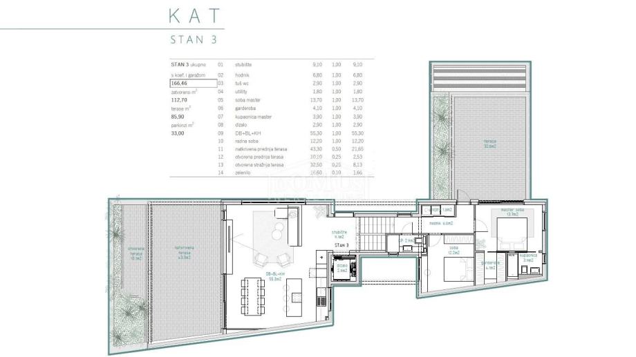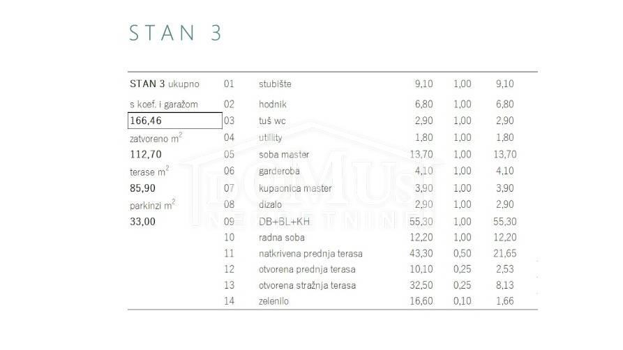 Stambena jedinica “S3”, koja se nalazi na prvom katu, ima korisnu površinu od 166,46 m². Stan se sastoji od ulaznog prostora, hodnika, kupaonice, WC-a s tušem, dvije spavaće sobe od kojih jedna ima vlastitu kupaonicu i garderobu s izlazom na terasu od 32,80 m², kuhinje, blagovaonice i dnevnog boravka s izlazom na terasu od 53,30 m². Stan također ima privatni lift koji vodi direktno u stan. Stanu pripada vrt te garažna parkirna mjesta.