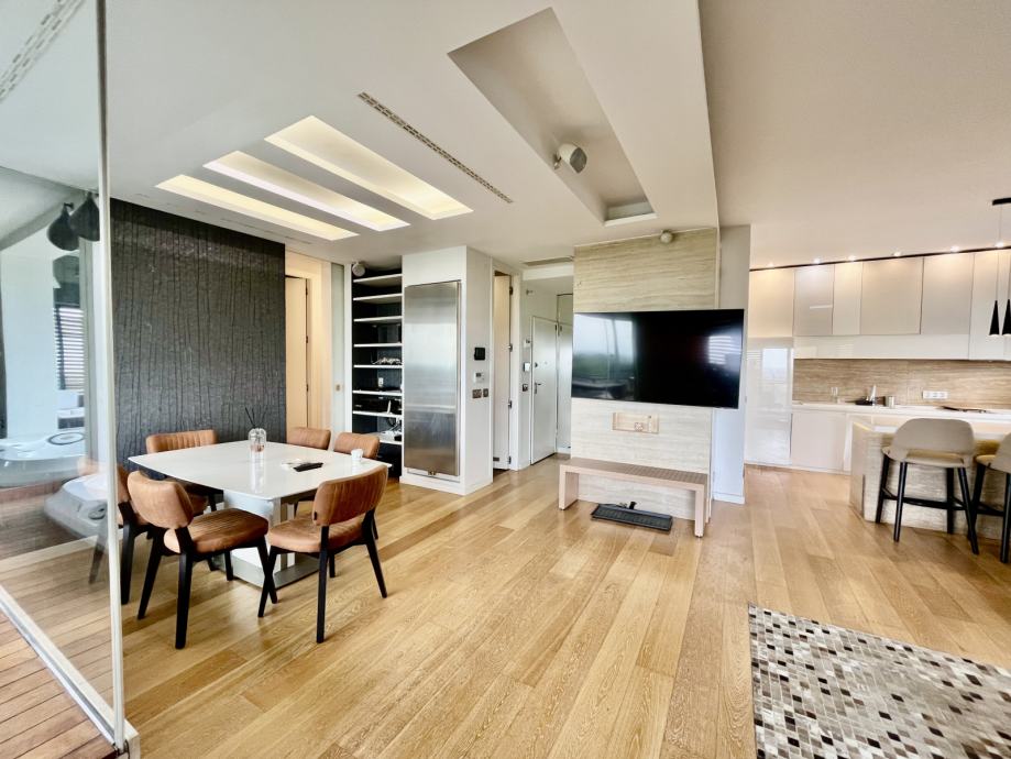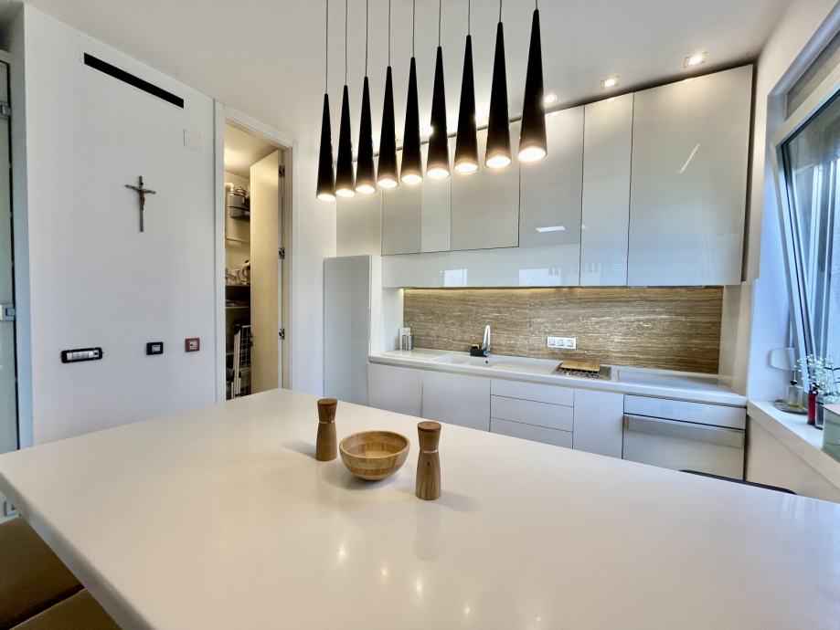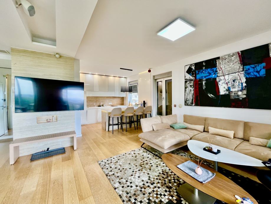Stan se sastoji od: Open space kuhinje s blagovaonicom i prostranim dnevnim boravkom, s izlazom na balkon s roštiljem i sjedećim dijelom za uživanje na otvorenom.
