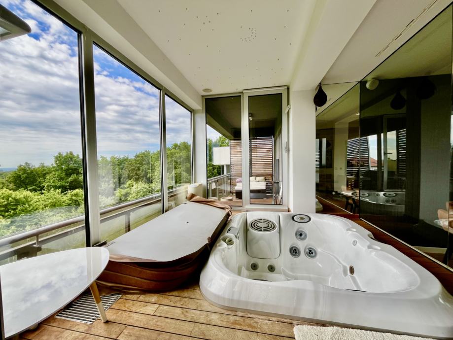 Zatvorene, ostakljene terase s jacuzziem, s koje se pruža pogled na grad i okolno zelenilo.