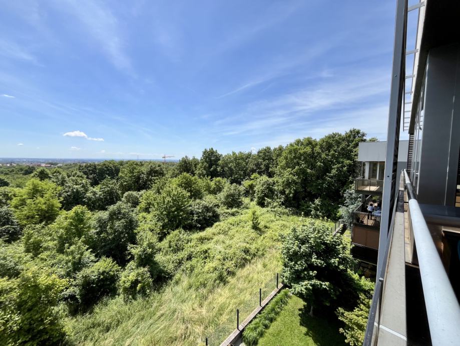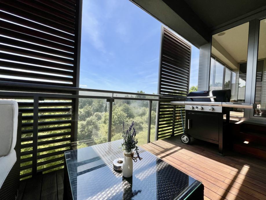 Ovaj prostrani stan južne orijentacije nudi vrhunski komfor s otvorenim pogledom na grad i okolnu prirodu uz obilje dnevnog svijetla. Uz sve dodatne vrijednosti koje stan pruža (dva parkirna mjesta, zajednička grijana teretana, slijepa ulica, sauna, jacuzzi, dva balkona i drugo), ovaj stan pruža osjećaj potpunog mira, intime te ugodu stanovanja.