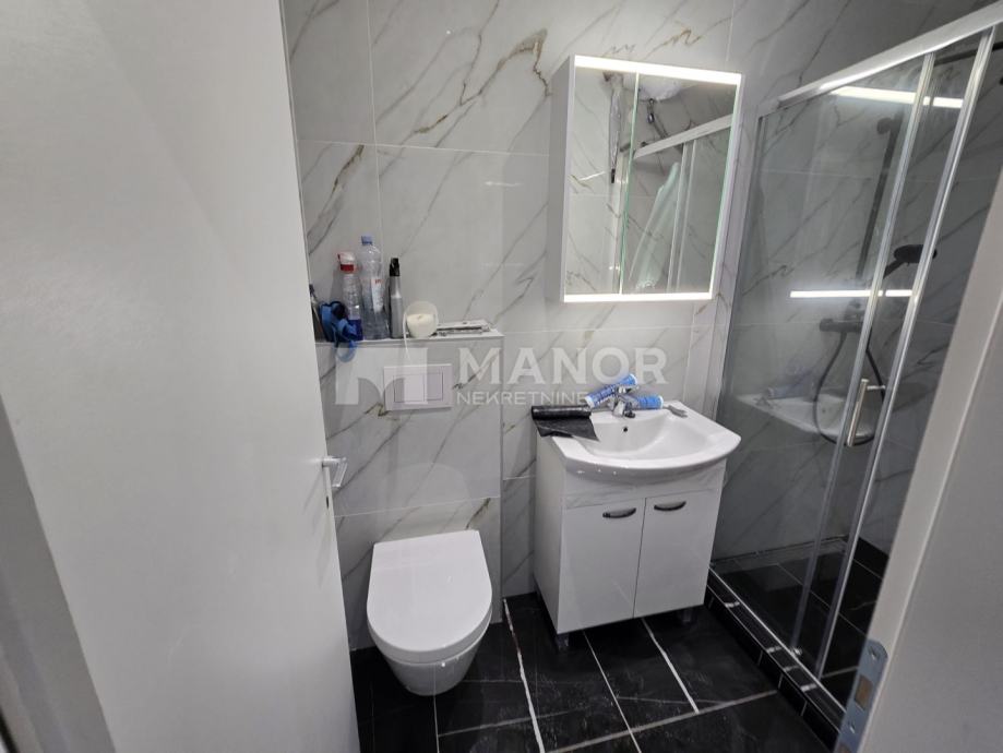 Kupaonica je opremljena walk-in tušem i elegantnim sanitarijama, što prostoru daje suvremen izgled.