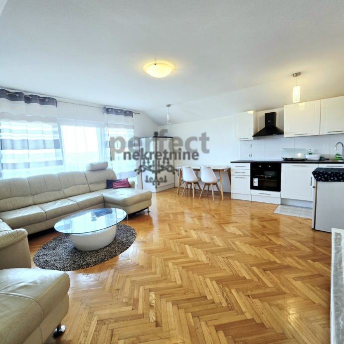 Stan površine od 60m2, potpuno je namješten, a sastoji se od ulaznog hodnika, kuhinje i blagovaone s dnevnim boravkom te izlazom na balkon, spavaće sobe, kupaone i ostave.