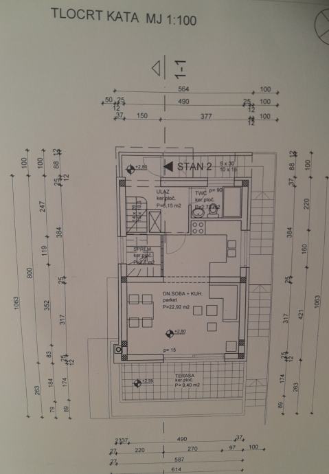 Stan je ukupne površine 82m2 te se prva etaža sastoji od ulaznog prostora, kuhinje, dnevnog boravka i blagovaonice, spremišta, stepeništa, gostinjskog wc-a i terase (9,40m2), a na gornjoj etaži smještene su 3 spavaće sobe, hodnik i kupaonica.