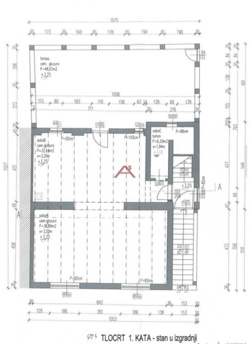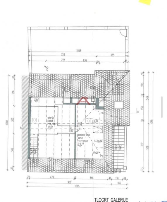 1. kat - površine 94,64 m2, roh-bau prostor s velikim potencijalom za daljnje uređenje u kojem centralno mjesto zauzima veliki zidani kamin a posebni ugođaj pruža velika terasa od 54 m2 okrenuta na dvorišnu stranu.