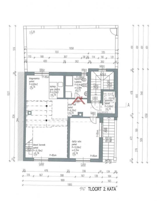 2. kat - površine 106,32 m2, kompletno uređen stambeni prostor koji se sastoji od ulaznog hodnik, spavaće sobe, velikog dnevnog boravaka s kuhinjom i blagovaonom, spremišta, te galerije sa dodatnom spavaćom sobom i radnim prostorom.