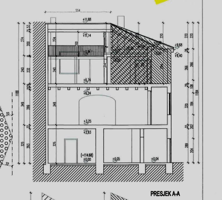Prodaje se poluugrađena kuća koja se sastoji od poslovnog prostora i tri stana na izuzetno atraktivnoj lokaciji. Kuća je površine 321 m2, a sastoji se od prizemlja, prvog i drugog kata te galerije. Prizemlje ima zaseban ulaz, a prvi kat i drugi kat su povezani unutarnjim stepeništem.