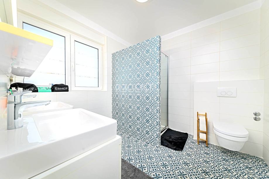 1 kat: Hodnik, balkon, vešeraj, kupaona, soba s garderobom, soba s balkonom