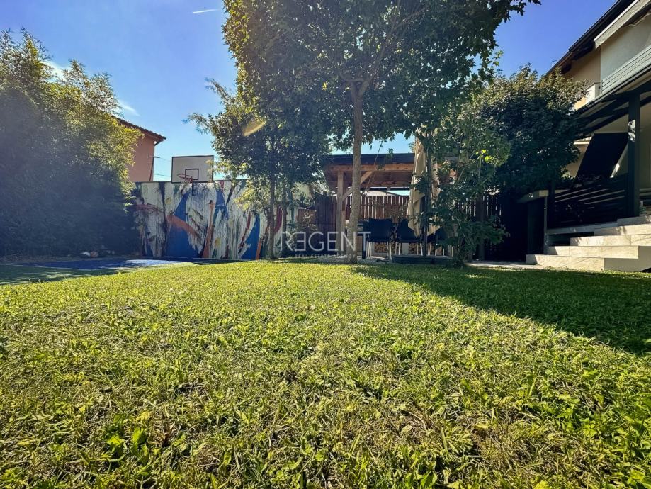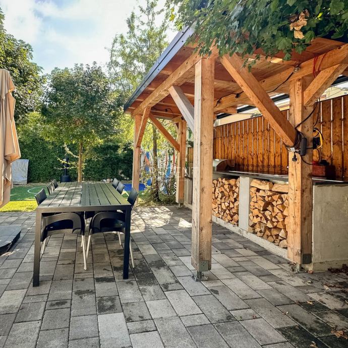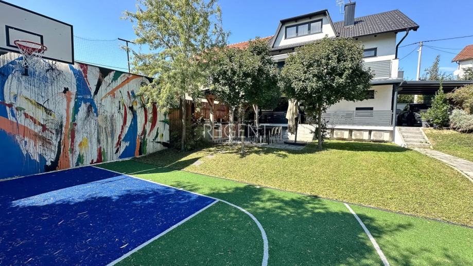 Oprema kuće i okućnice: Dankuchen kuhinja, Bosch ugradbeni aparati: hladnjak, pećnica, plinska ploča za kuhanje, Bosch kondenzacijski bojler, Buderus radijatori, Hansgrohe slavine, Laufen umivaonici, Villeroy wc školjke, Toshiba klima uređaji, Vimar elektro prekidači i utičnice, Rehau stolarija, Velux krovni prozori, troslojni parket hrast, ugradbeni ormari, optički internet, alarmni sustav sa senzorima Bosch, video nadzor okućnice, automatska klizna dvorišna ograda, Assa Abloy protuprovalna ulazna vrata, osvjetljena okućnica, natkriveni parking, dvije vanjske ostave, vanjska kuhinja, košarkaški teren 9x6m, Semmelrock dvorišni opločnici – Haering termo fasada s izolacijom 12cm.
