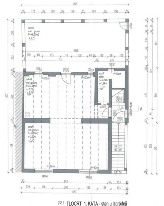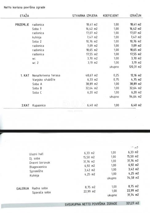 U prizemlju se trenutno nalazi poslovni prostor (radiona) površine 120 m², idealan za razne djelatnosti ili prenamjenu prema potrebama budućih vlasnika. Na prvom katu smješten je stan od 78 m² koji je u fazi adaptacije, što ostavlja mogućnost uređenja po vlastitim željama. Iz tog stana izlazi se na veliku, prostranu terasu površine 49 m², idealnu za odmor, druženje ili zeleno uređenje.