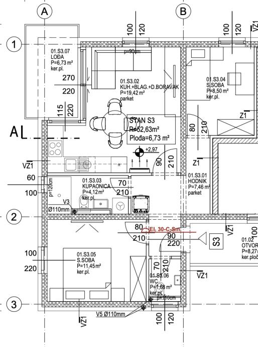 Zagreb, Maksimir, trosoban stan u prizemlju novogradnje s ukupno 4 stana i privatnim parkirnim mjestom, smješten u mirnom okruženju prirode.Stan S3 nalazi se na prvom katu zgrade C, te se sastoji od ulaznog hodnika, dnevnog boravka s kuhinjom i blagovaonicom te izlazom na lođu 6,73 m²...