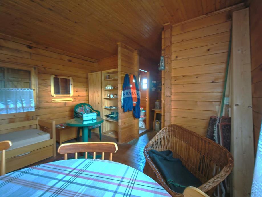 Ovo nije velika obiteljska kuća. Ovo je mala, autentična brvnara na prostranoj parceli s travnjakom koji se spušta niz padinu. Potpuno drvena, crna fasada, crveni crijep, natkrivena terasa, veliki drveni piknik-stol, kamena peć za roštilj i voćke koje već rađaju. Unutrašnjost je jednostavna i spremna za useljenje: kreveti na kat, blagovaonski stol, pletena fotelja, police i sve što je potrebno za ugodan boravak.