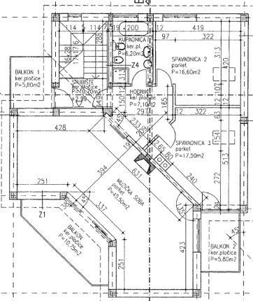 Sastoji se od 3 etaže površine 104 m, balkoni i terase još dodatnih 27 m2.