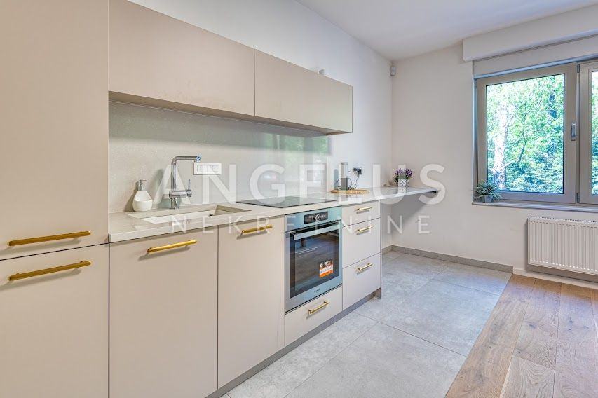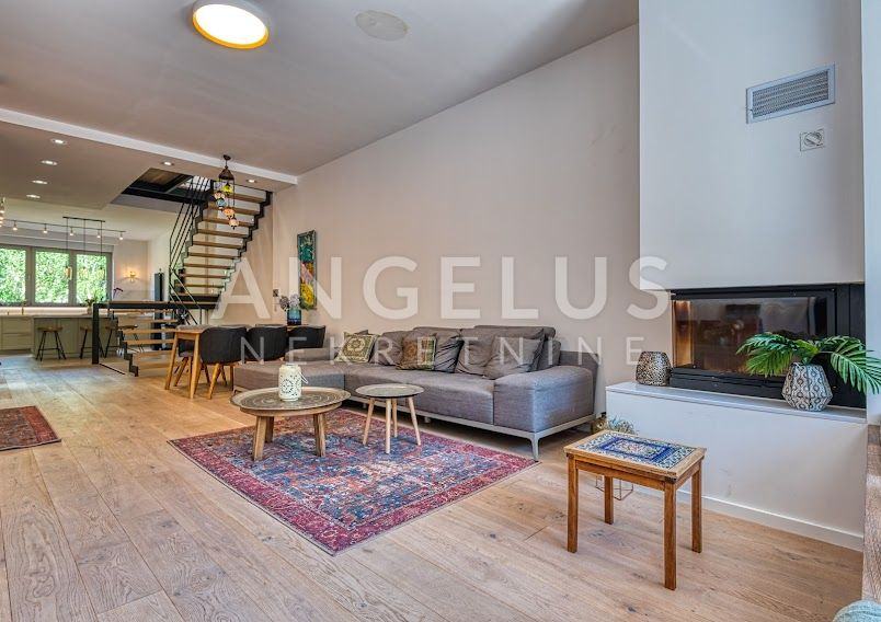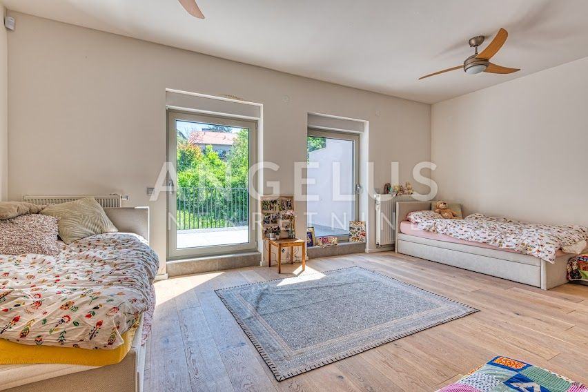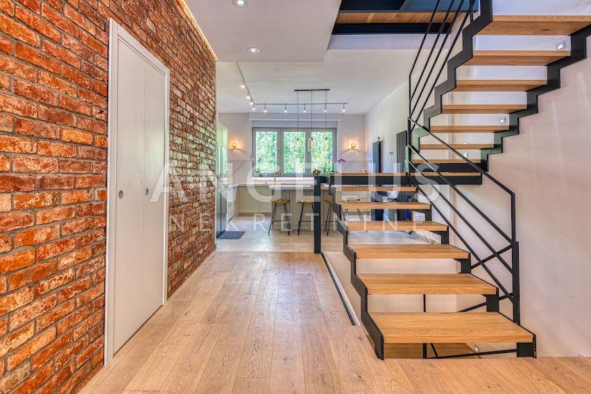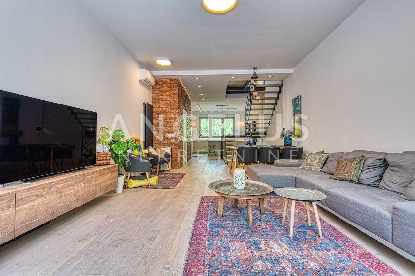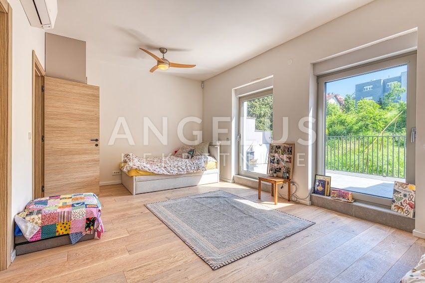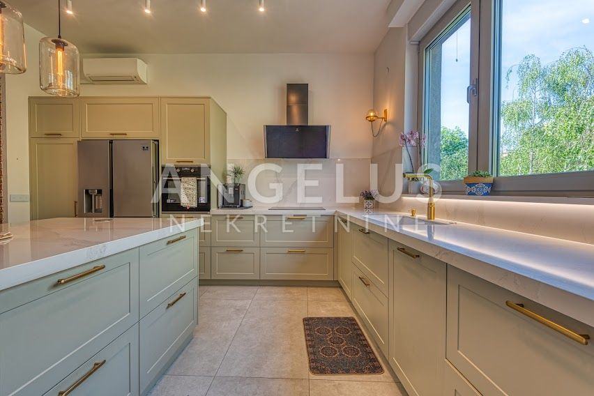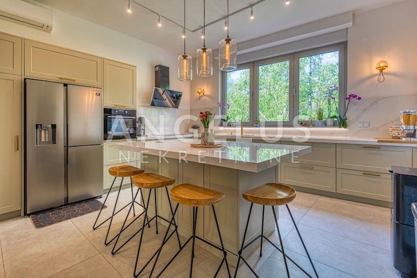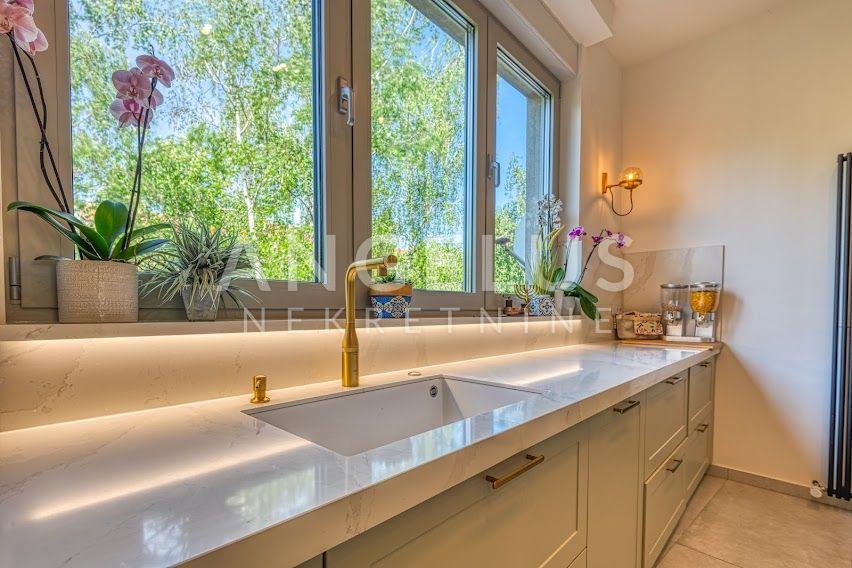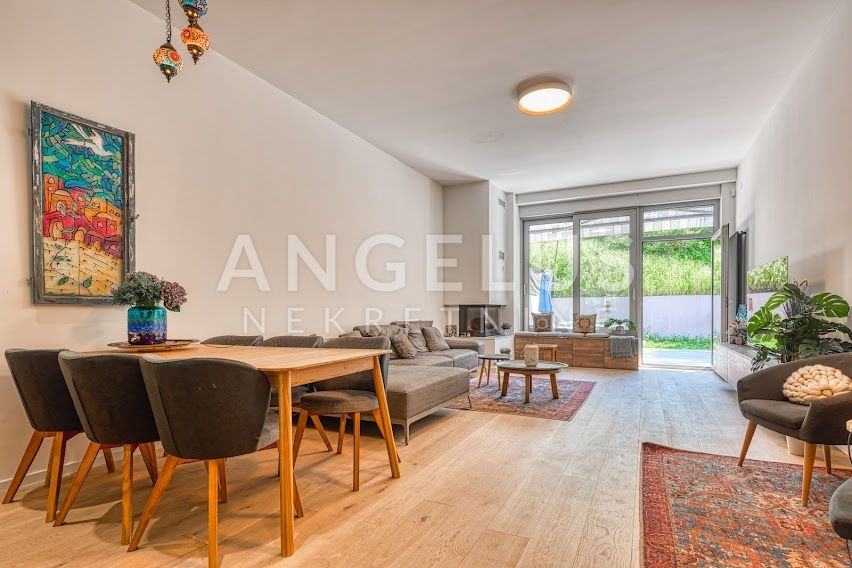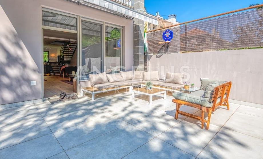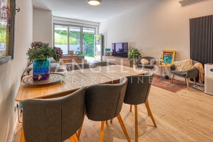 Kuća je izgrađena 40-ih godina prošlog stoljeća, a stan je kompletno renoviran i konstrukcijski ojačan prije tri godine. Stan površine 204 m2, prostire se na 4 etaže. U podrumu se nalazi gostinjska soba sa kupaonicom i spremištem, a u prizemlju je ulazni prostor i radna soba. Na prvom katu, koji je zapravo prizemlje sa dvorišne strane je velika otvorena kuhinja povezana sa dnevnim boravkom i izlazom na vrt (50 m2) i kupaonica, a na zadnjoj etaži su dvije spavaće sobe sa svojim kupaonicama i 2 balkona (3 m2, 17 m2). Veliku dječju sobu je moguće pregraditi u dvije manje. Plinsko centralno grijanje, namjleštena kuhinja, ugradbeni ormari, hrastov seljački pod, aluminijska stolarija, kamin, Daikin klimatizacijski uređaji s inverterom. Javni naplatni parking je dostupan ispred kuće.