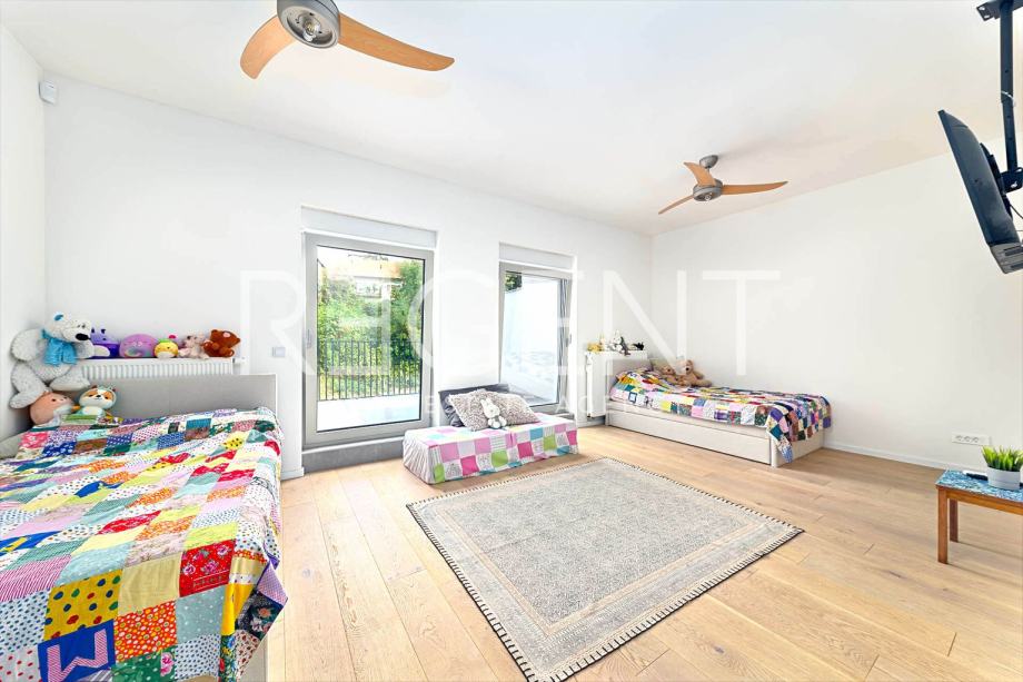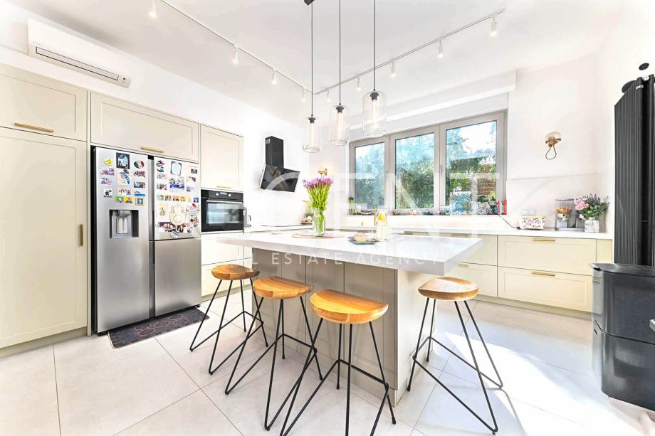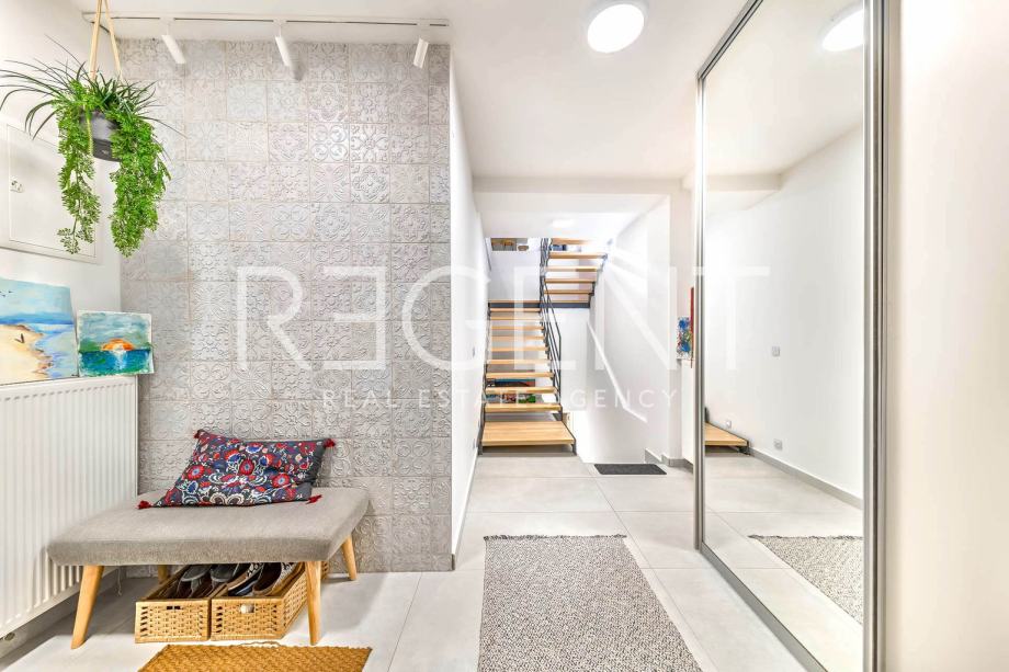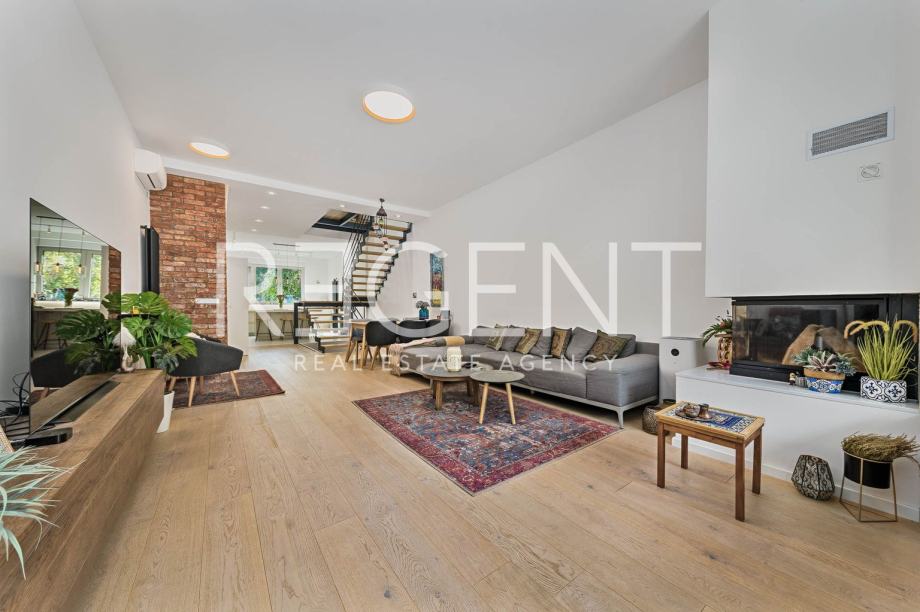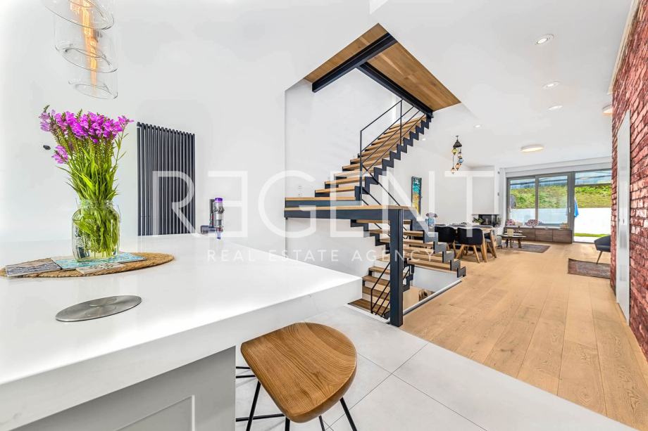 Luksuzno uređena četverosobna kuća u nizu s vrtom, smještena na vrhunskoj lokaciji u samom srcu grada, u neposrednoj blizini svih potrebnih sadržaja za kvalitetan život.Proteže se na 190,47 m2 zatvorene površine raspoređene na četiri etaže, povezane unutarnjim stubištem. Podrum nudi otvoreni prostor koji se može prilagoditi raznim potrebama (fitness, vinski podrum, ured), te uključuje kupaonicu, spremište i vešeraj.U prizemlju se nalaze ulazni hodnik i radna soba. Prvi kat se sastoji od prostranog dnevnog boravka s kuhinjom i blagovaonicom otvorenog tlocrta, s izlazom na terasu od 19,75 m2 i vrt od 47,00 m2, smještenih na mirnoj dvorišnoj strani. Na drugom katu se nalaze hodnik, glavna spavaća soba s kupaonicom i izlazom na terasu od 3,75 m2, te prostrane dječje sobe s kupaonicom i izlazom na terasu od 11,42 m2, koje se po potrebi mogu pregraditi u dvije spavaće sobe. Ukupna obračunska NKP iznosi 237,28 m2. Pri uređenju i renoviranju korišteni su najkvalitetniji materijali i oprema visoke klase. Betonska konstrukcija, aluminijska stolarija s troslojnim staklom, dizajnerski opremljene kupaonice s vrhunskim sanitarnim elementima (GROHE), parketi A klase, klimatizirane sve prostorije. Etažno plinsko grijanje s visokokvalitetnim radijatorima i smart home sustavom, kamin, klima uređaji Daikin, sustav za pročišćavanje i omekšavanje vode, te smart sustav za rolete i svjetla koji se kontrolira putem aplikacije ili Amazon Alexa sustava. Kuhinja je rađena po mjeri, kao i svi ugradbeni ormari u sobama, u neutralnim bojama.Za sve dodatne informacije, slobodno nas kontaktirajte!Za više informacija, kontaktirajte našeg agenta na brojeve telefona: