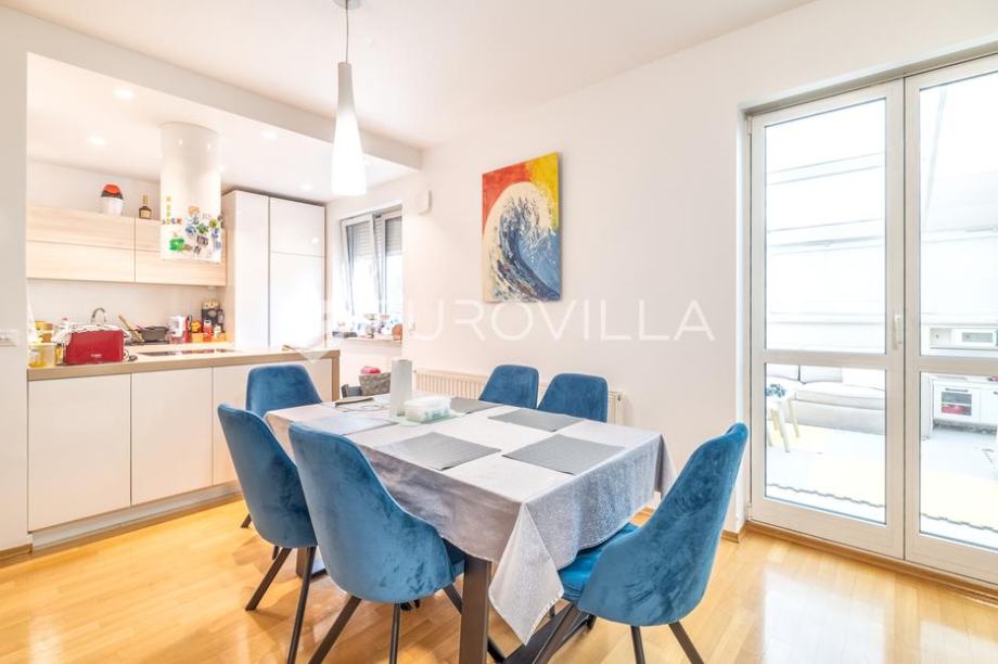 Donji grad, three-room apartment in the basement, in a newly built building with a winter garden, terrace and garage NKP 124 m2. It consists of an entrance hall, an open space kitchen with a dining room and a living room with access to the winter garden, then two bedrooms, a laundry room, a...
