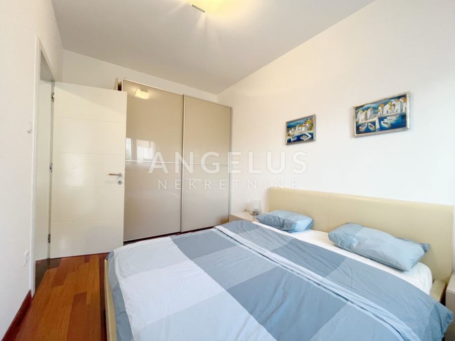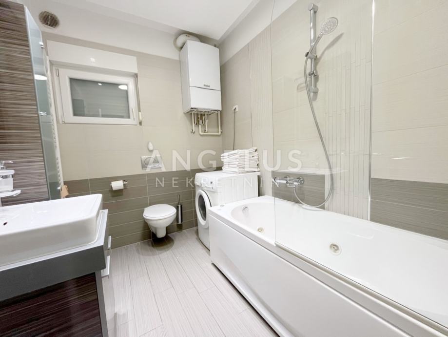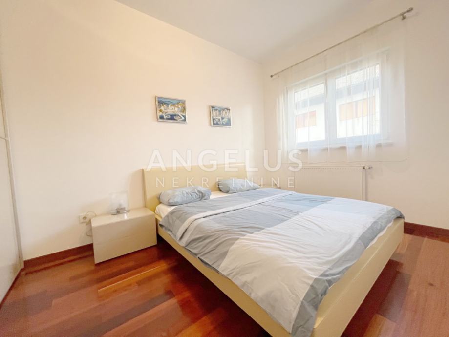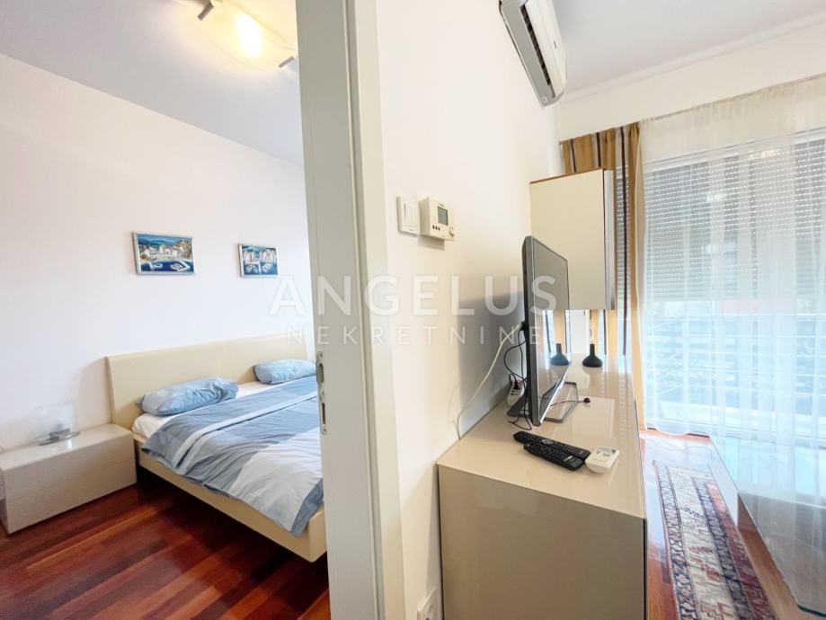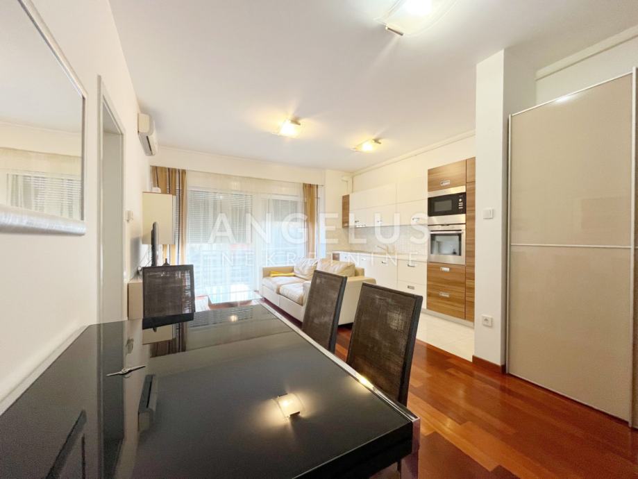 Nalazi se u visokom prizemlju novije zgrade a, sastoji se od dnevnog boravka sa blagovaonicom spojene sa kuhinjom, spavaće sobe, kupaonice i balkona. Potpuno je namješten i ima parkirno mjesto u dvorištu zgrade. Mogućnost korištenja teretane, saune i hidromasažne kade u zgradi udaljenoj samo 100-ak m od stana.