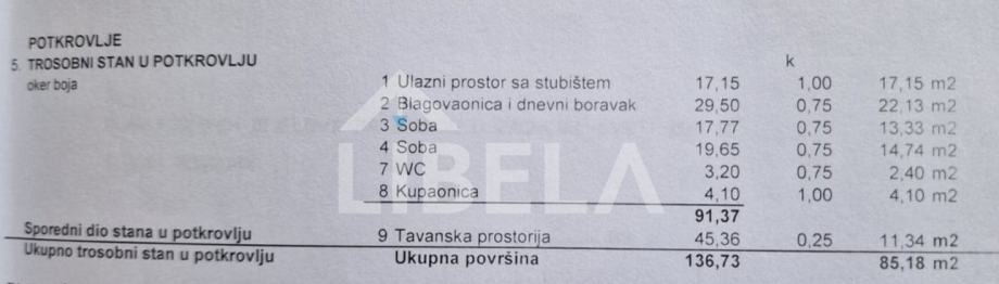 Sastoji se od ulazne galerije s podestom na kojem se može napraviti, npr. mali radni dio, dvije spavaće sobe, dnevne sobe s kuhinjom i blagovaonom, kupaonice i dodatnog wc-a, podne površine 91 m2. Iznad stana je i tavan površine 45 m2.