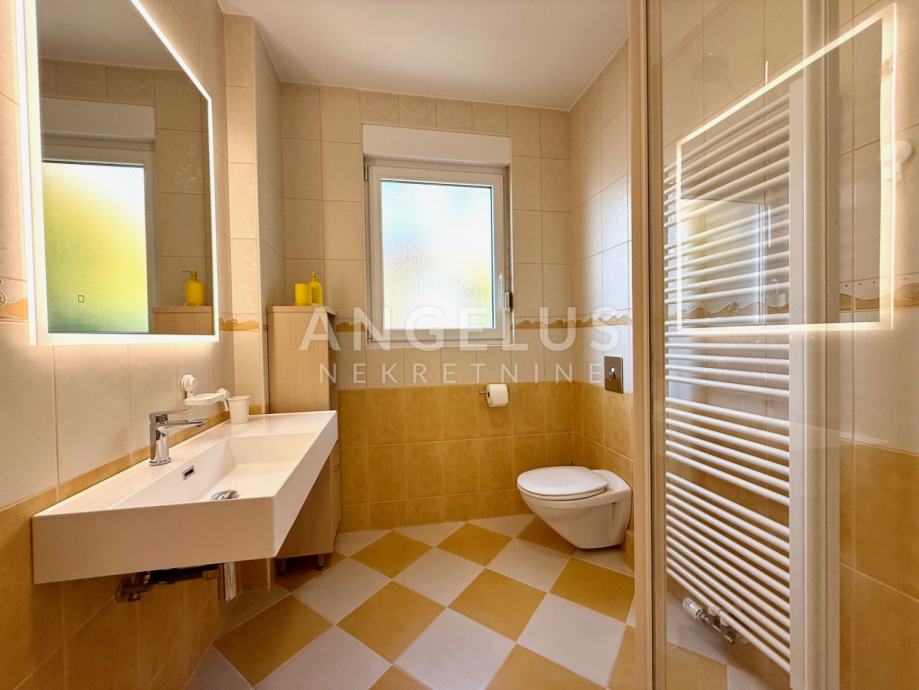 Dvojna kuća površine 240 m2, prostire se na dvije etaže, prizemlja i kata. U prizemlju se nalazi ulazni prostor s velikom garderobom, garaža, 3 velike spavaće sobe, dvije kupaonice od kojih jedna ima tuš, a druga ima kadu.