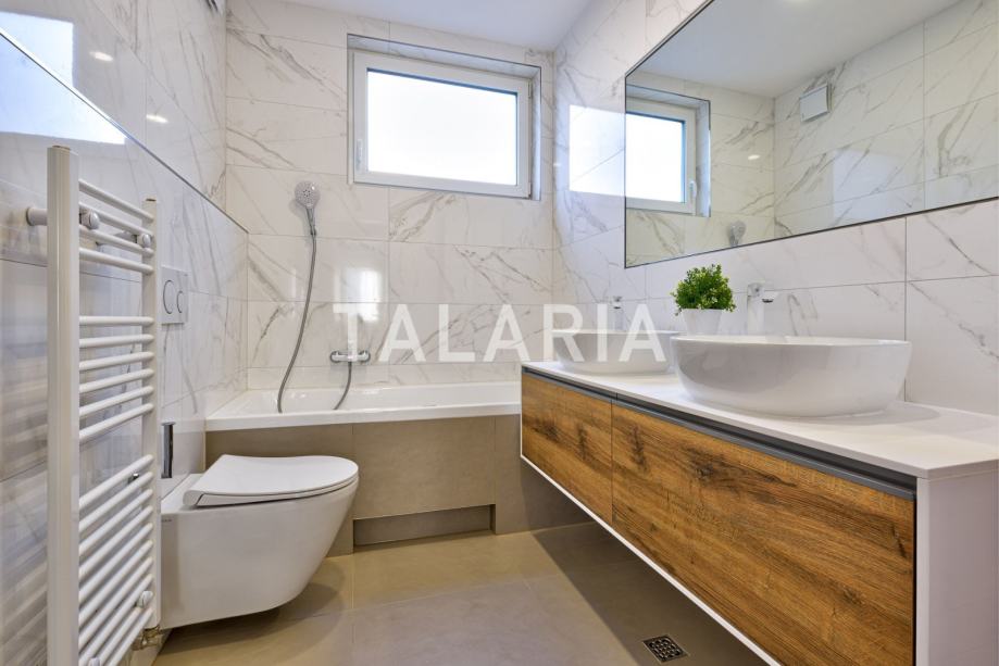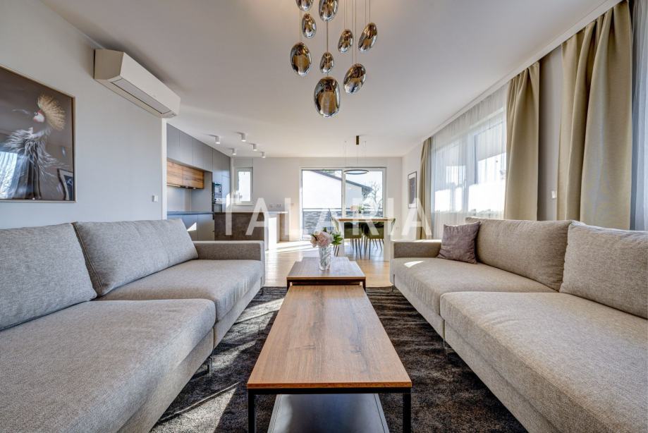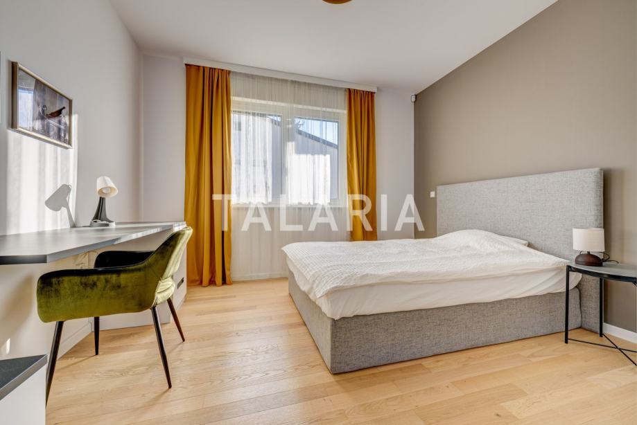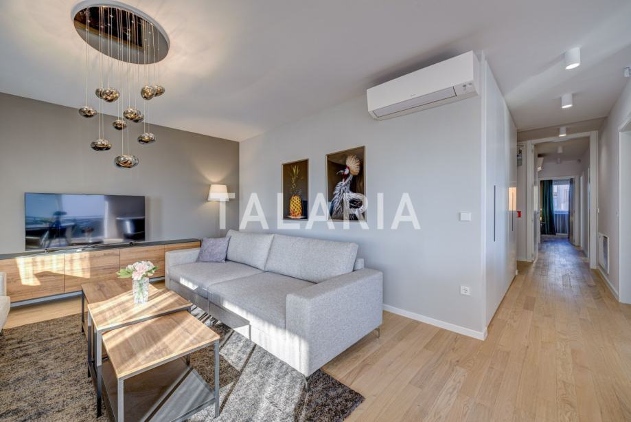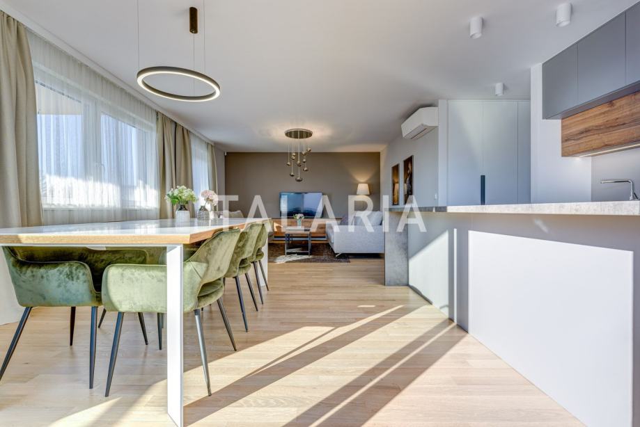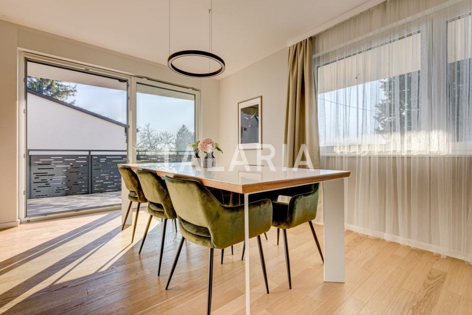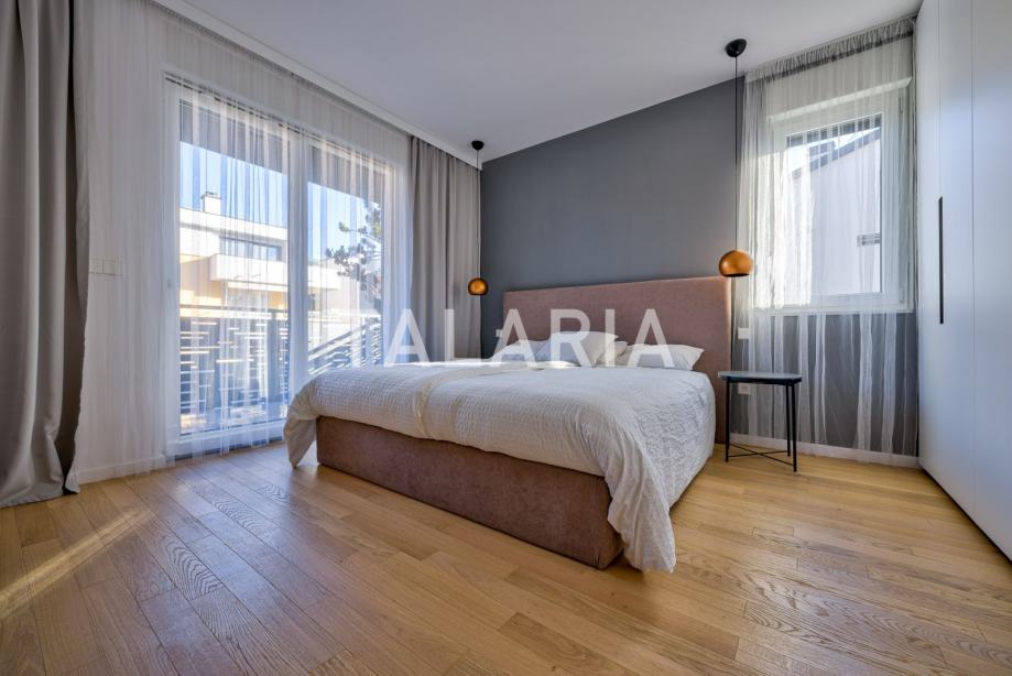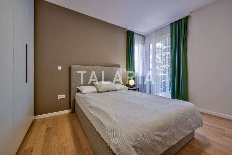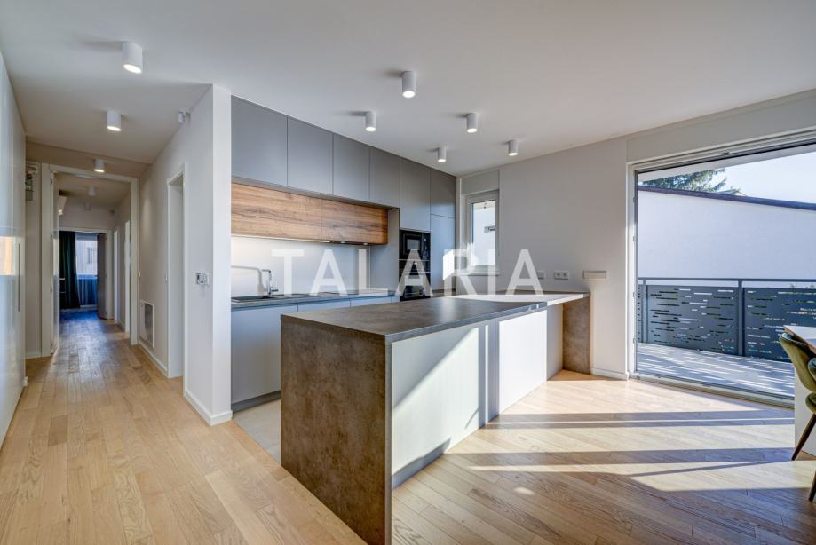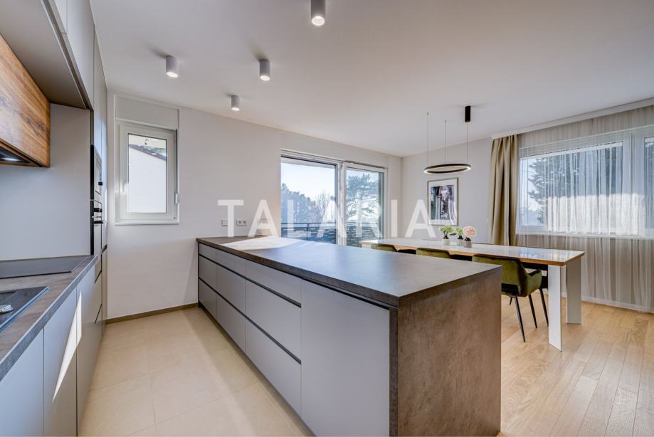 Luksuzan, potpuno novi četverosoban stan od 166m2 na Pantovčaku, orijentiran na sve četiri strane svijeta. Nalazi se na prizemlju novoizgrađene zgrade sa samo 3 stana. Sastoji se od ulaznog prostora, prostranog dnevnog boravka s kuhinjom i blagavaonom, 3 spavaće sobe, 2 kupaone, gostinjskog toaleta i vešeraja, ostave i balkona. Pripada mu vrt i 2 parkirna mjesta. Vrhunski materijali i dizajnerski namještaj. Kroz cijeli stan je provedeno podno grijanje. Vanjska stolarija je PVC sa sedam komora i troslojnim staklima, što osigurava odličnu toplinsku izolaciju. Postavljen alarmni sustav, videoportafon. Može se iznajmiti garaža za 100eura/mjesečno.