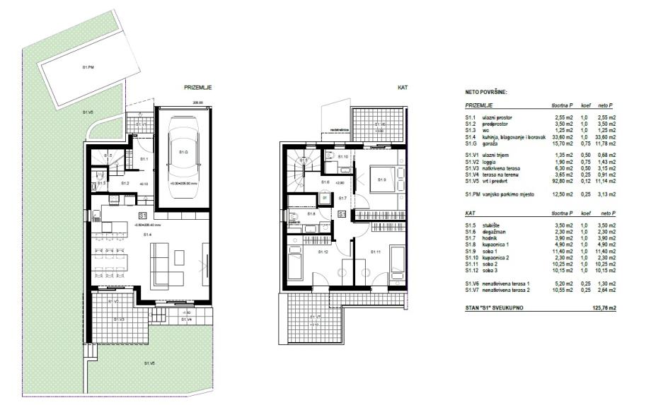 Kuća S1 - razvedena na dvije etaže, zatvorene površine 90 m2 sa jednom natkrivenom i dvije nenatkrivene terase, terasom na terenu, vrtom 93 m2, garažom 16 m2 i vanjskim parkirnim mjestom.