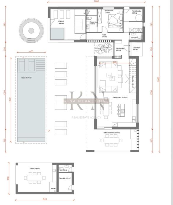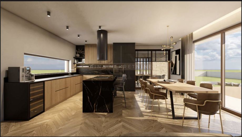 - Prostrani dnevni boravak s open space kuhinjom (55,85 m2) i izlazom na natkrivenu terasu (22 m2) s pogledom na šumu i zelenilo