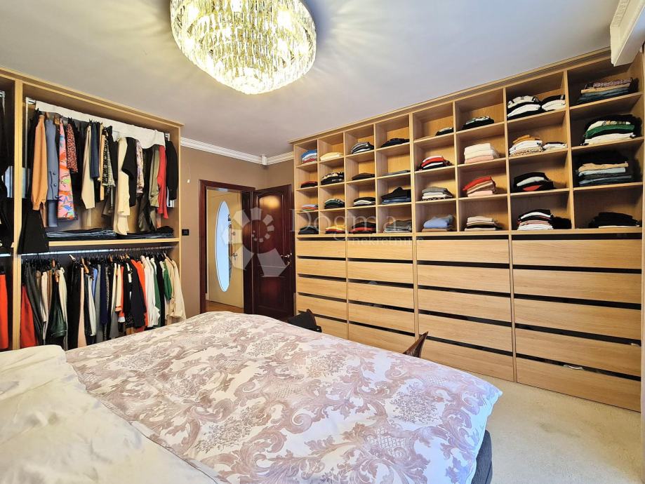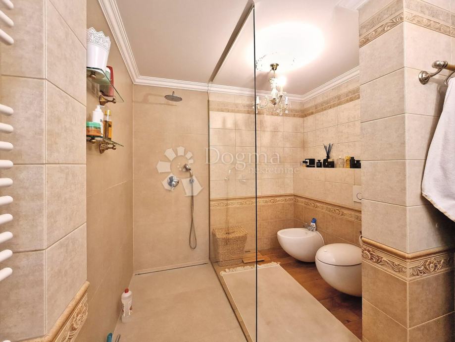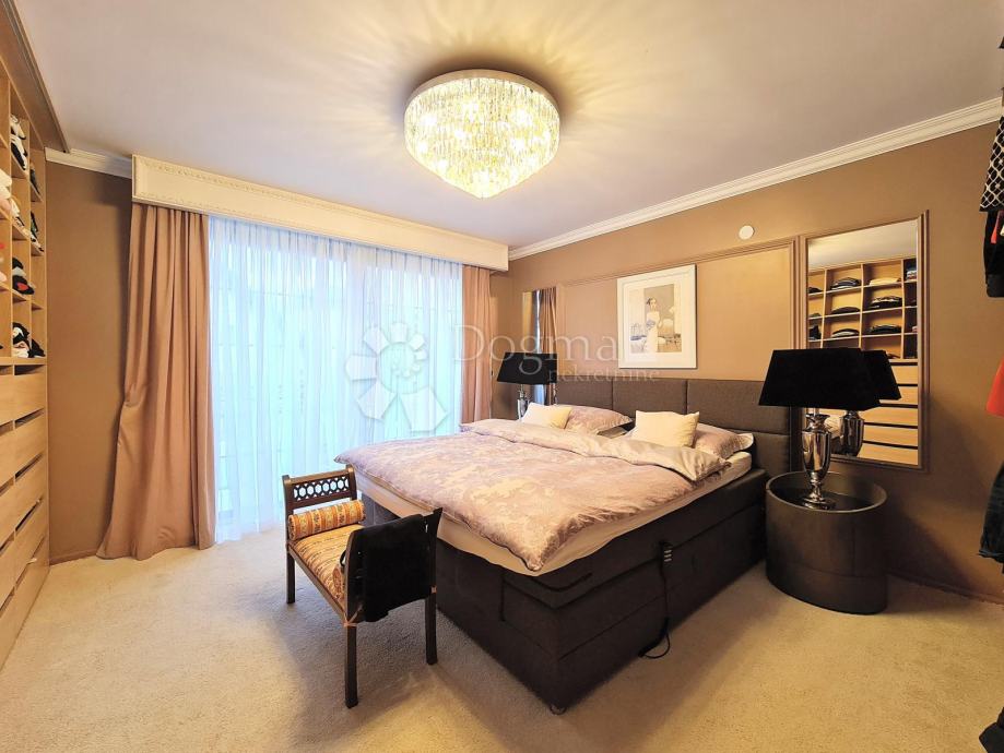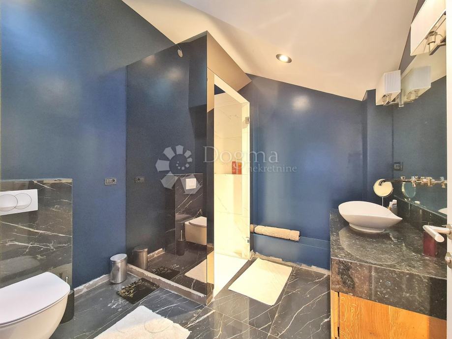 Prizemlje: unutarnji bazen (11m x 6m), sauna, walk in tuš, toalet, vešeraj, kotlovnica i 2 garaže, te stambena površina 120m2