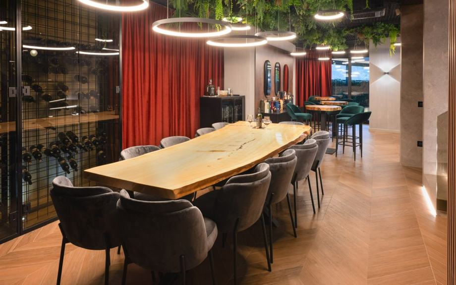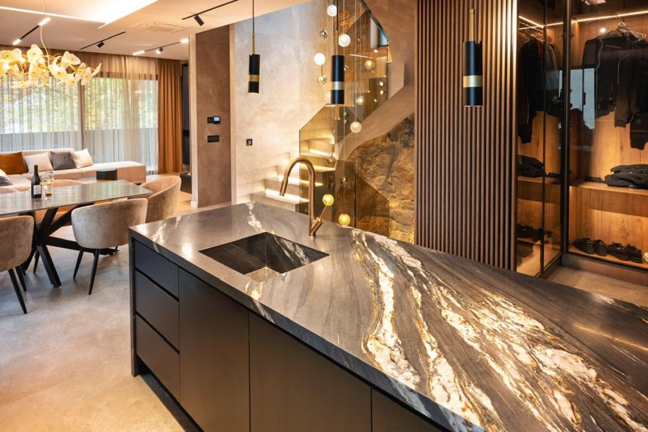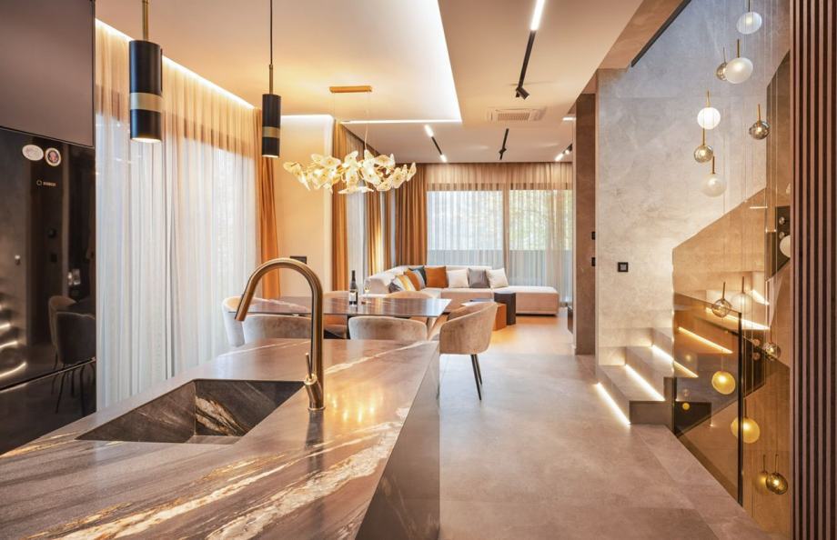 • Prizemlje: Impresivan open-space prostor koji spaja prostrani dnevni boravak, modernu kuhinju opremljenu vrhunskim aparatima te elegantnu blagovaonicu. Uz to, nalazi se i garderoba za dodatnu funkcionalnost.
