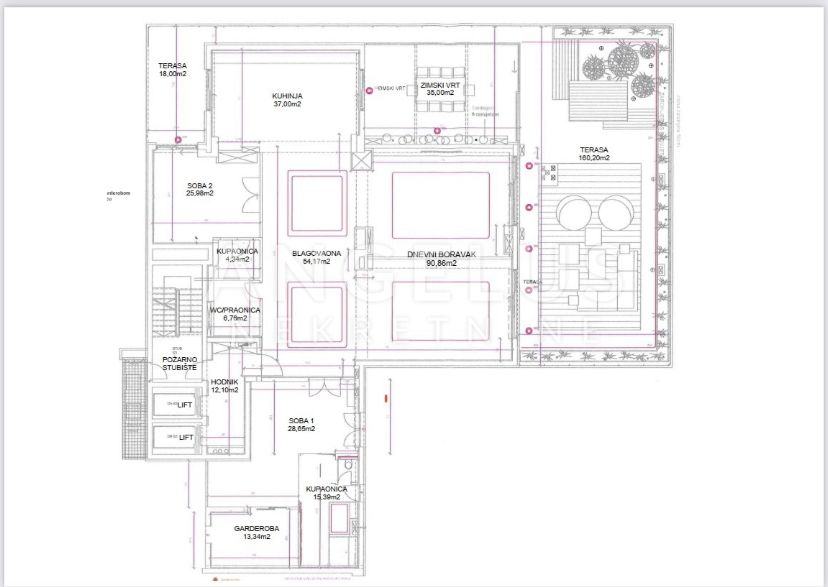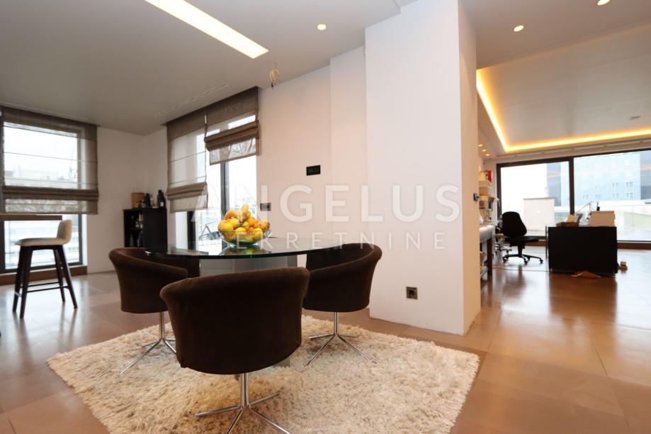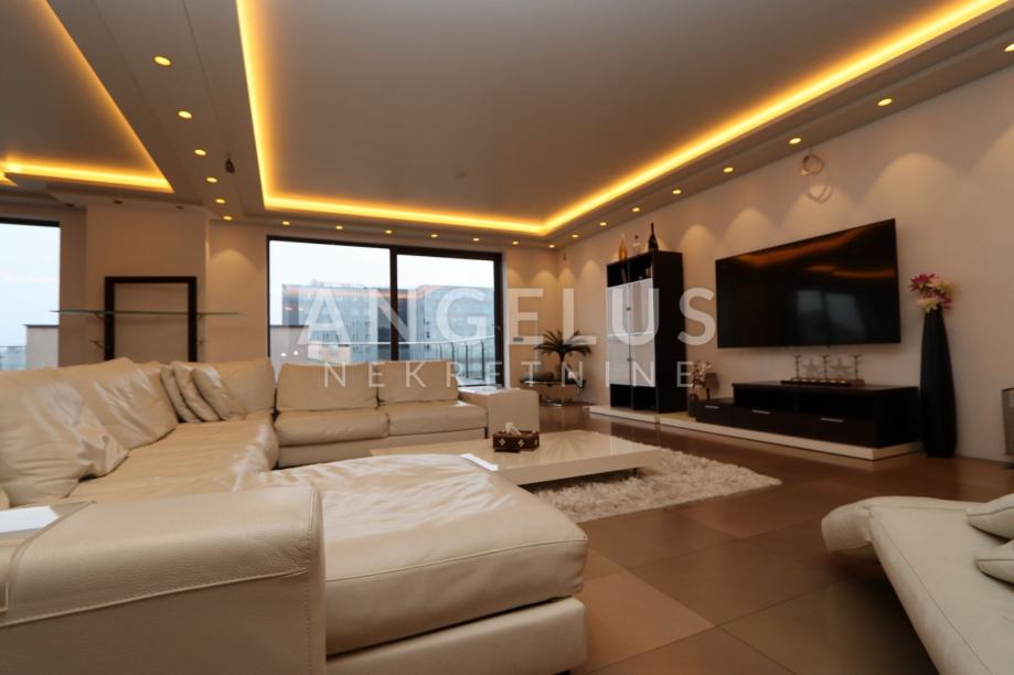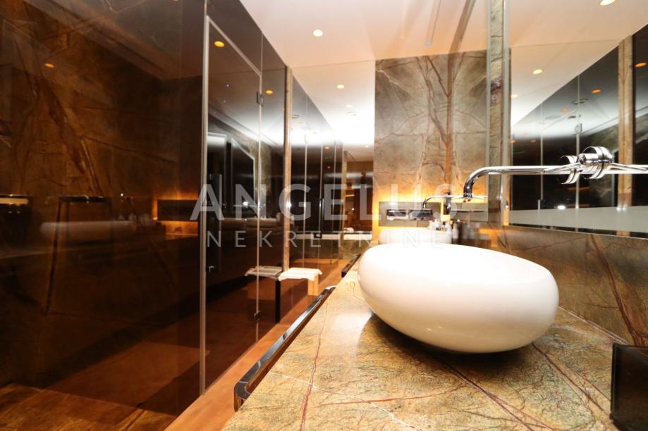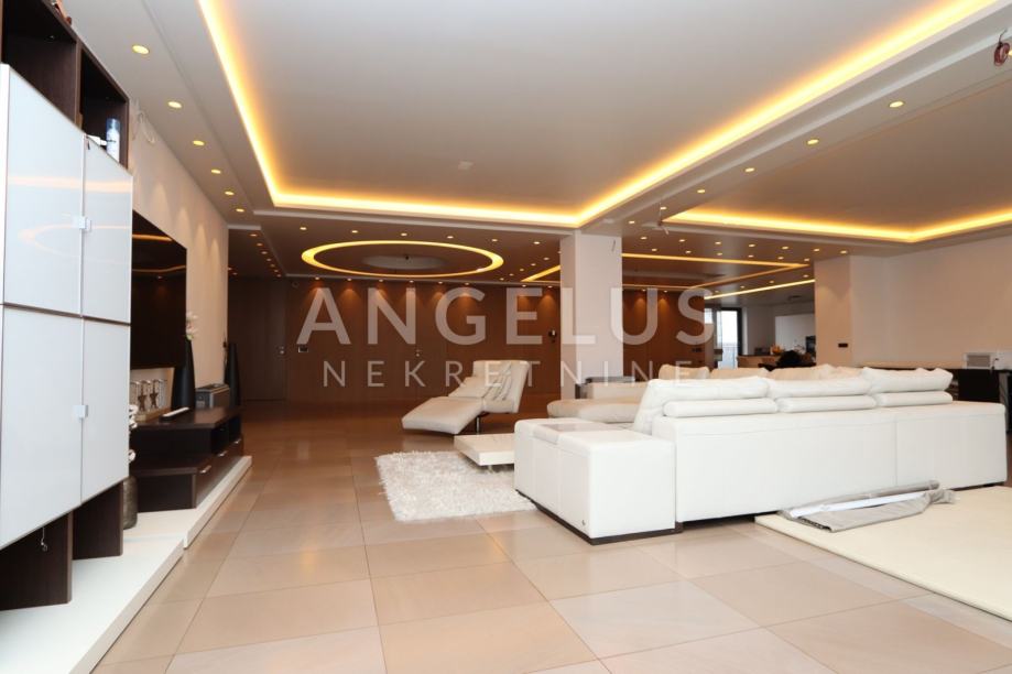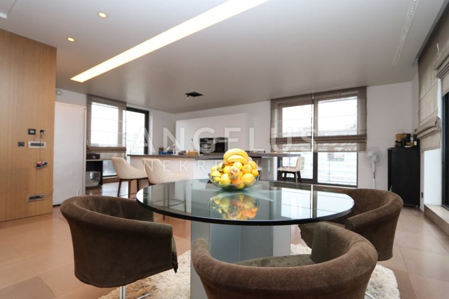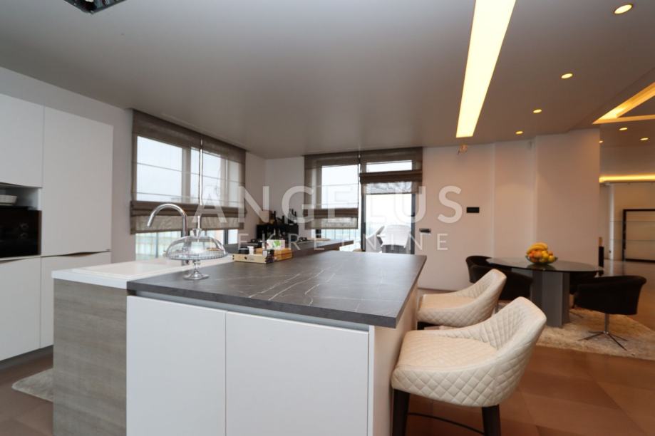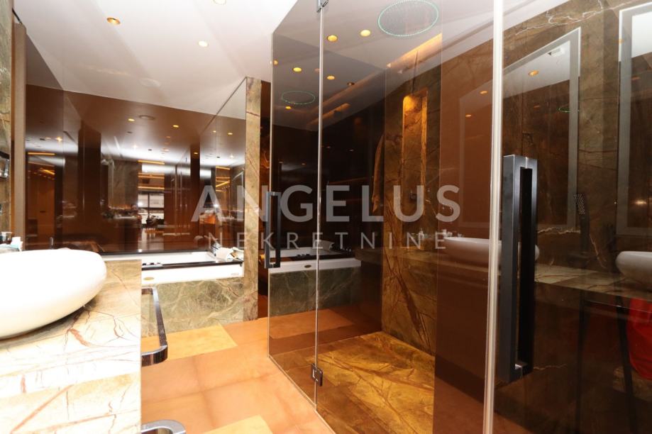 Moderan luksuzni penthouse NKP 276m2, terasa 213m2, sveukupno 490m2 tlocrtne površine; sastoji se od prostranog dnevnog boravka (90 m2) , blagovaonice (54 m2) iz koje se izlazi na terasu i na zimski vrt, kuhinje otvorenog tipa, master spavaonice sa kupaonicom koja ima hidromasažnu kadu, walk-in tuš, tursku saunu i walk in veliku garderobu, manje spavaće sobe sa kupaonicom koja ima walk-in tuš, hodnika, te gostinjskog wc-a i praonice rublja.