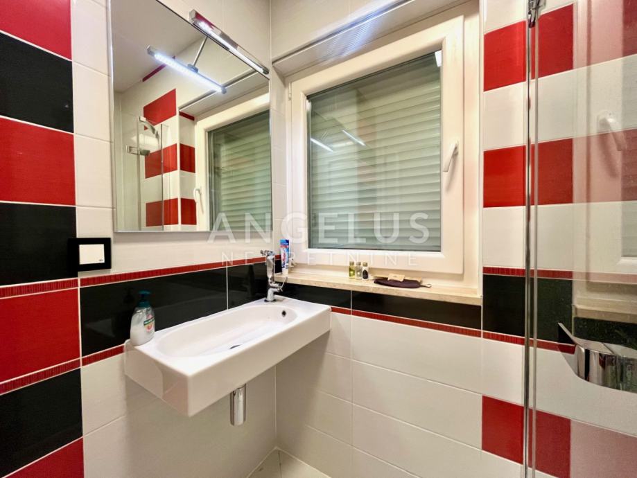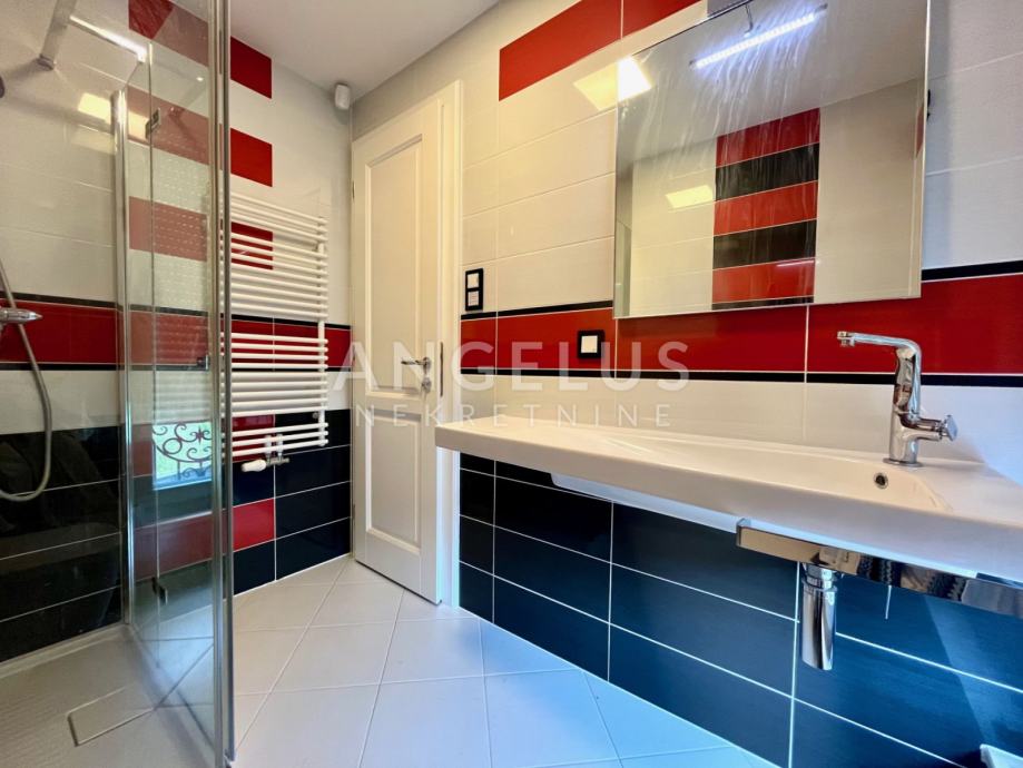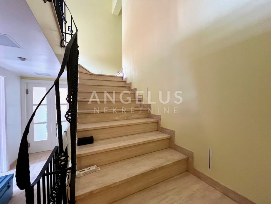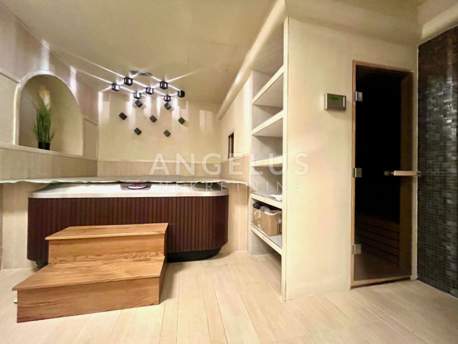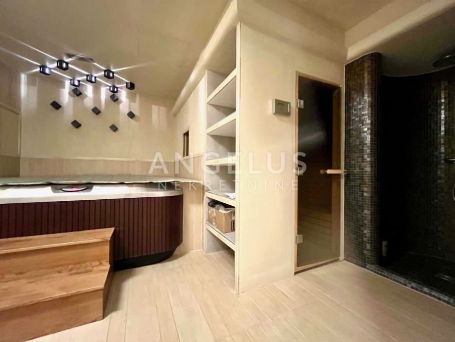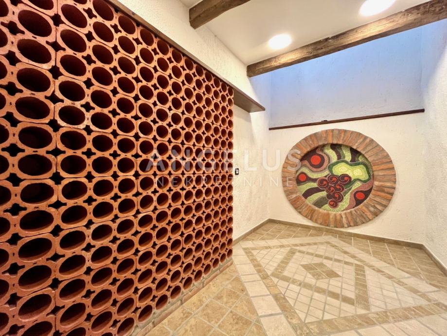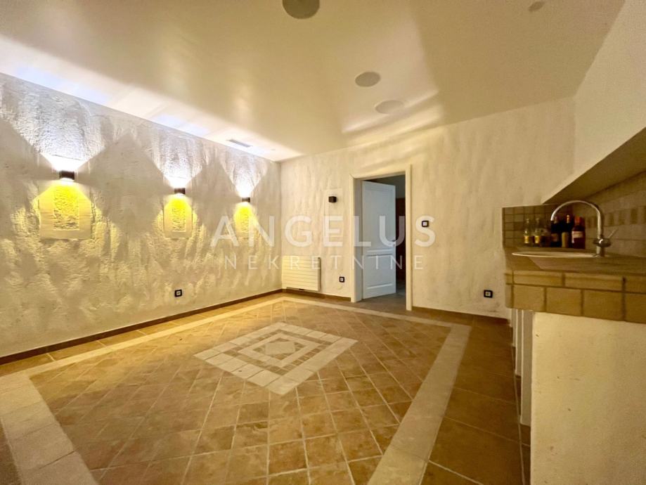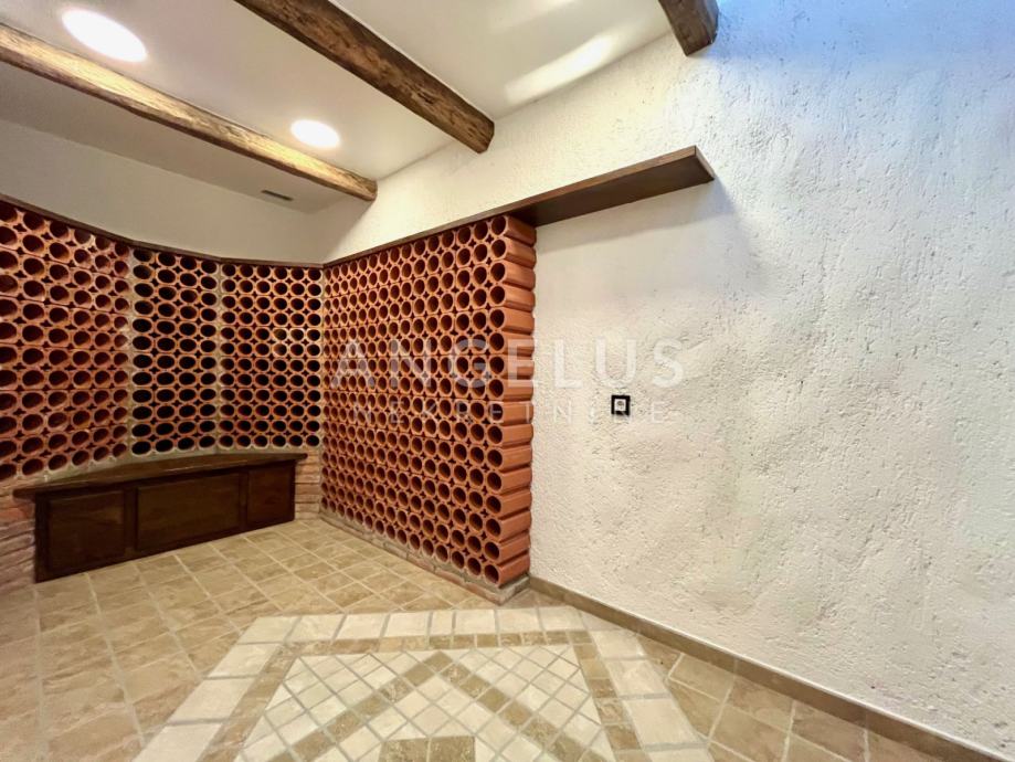 Podrum: gospodarski prostor-praona rublja, prostor za smještaj tehnike, izba, kotlovnica, wc, prostor za druženje s vinskim podrumom, wellness, fitness, prostorija za bazensku tehniku te garaža za 2 automobila.