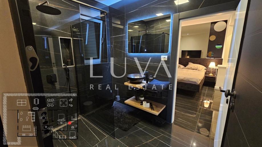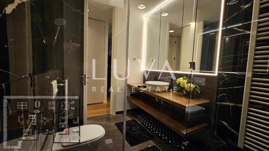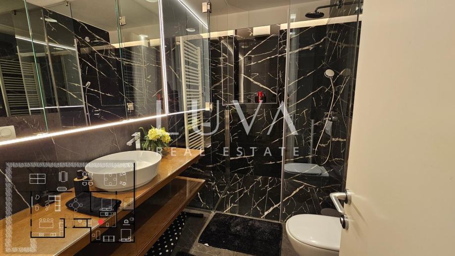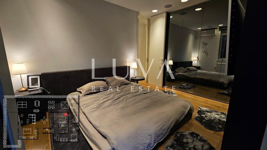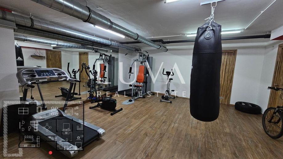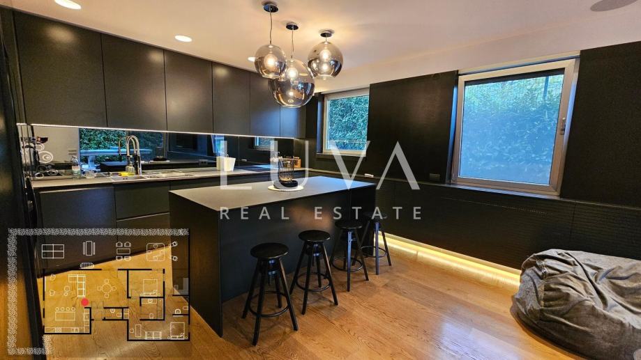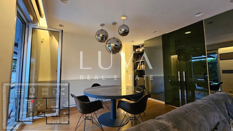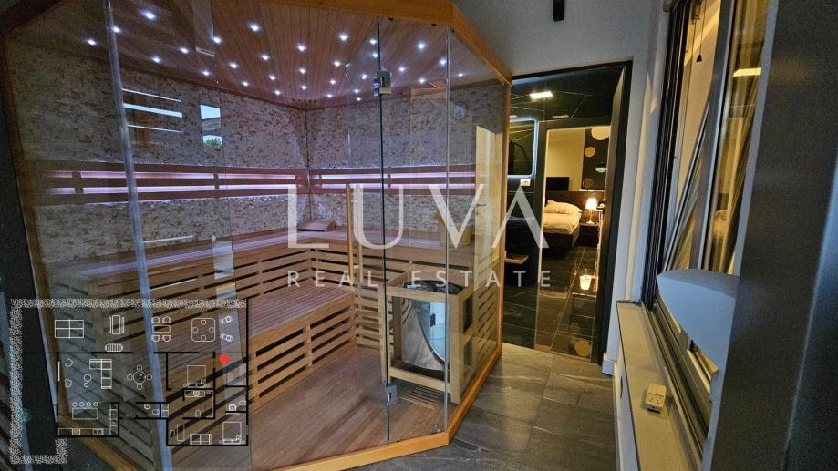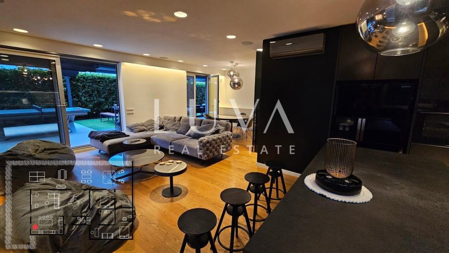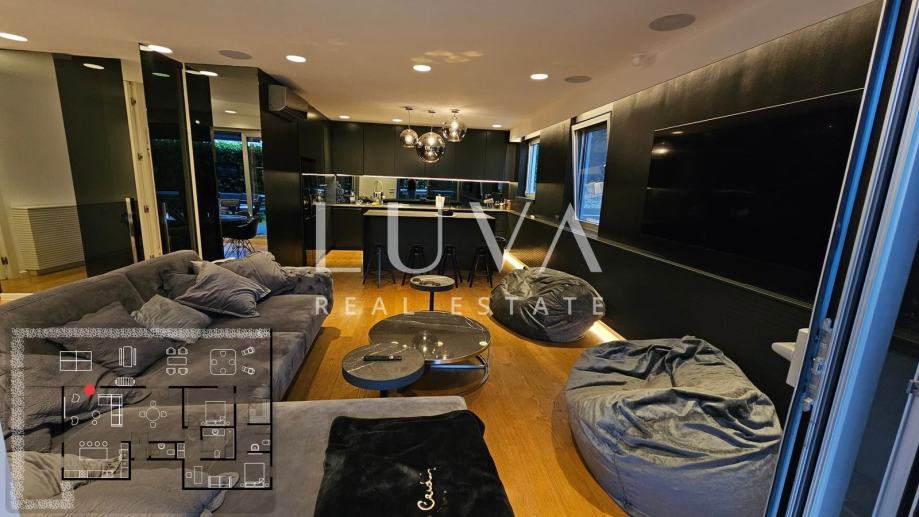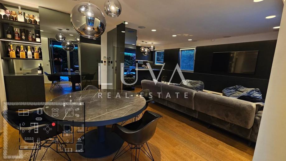 Stan je u potpunosti luksuzno namješten i opremljen vrhunskim sustavima. Klimatizacija u svim prostorijama, skriveni radijatori, premium audio sustav u dnevnoj i spavaćim sobama, televizori u svakoj prostoriji te najbrži optički internet s najkvalitetnijim routerima. Uz samu nekretninu dolazi garaža za dva automobila, dva dodatna vanjska parkirna mjesta te podrum od 10 m².