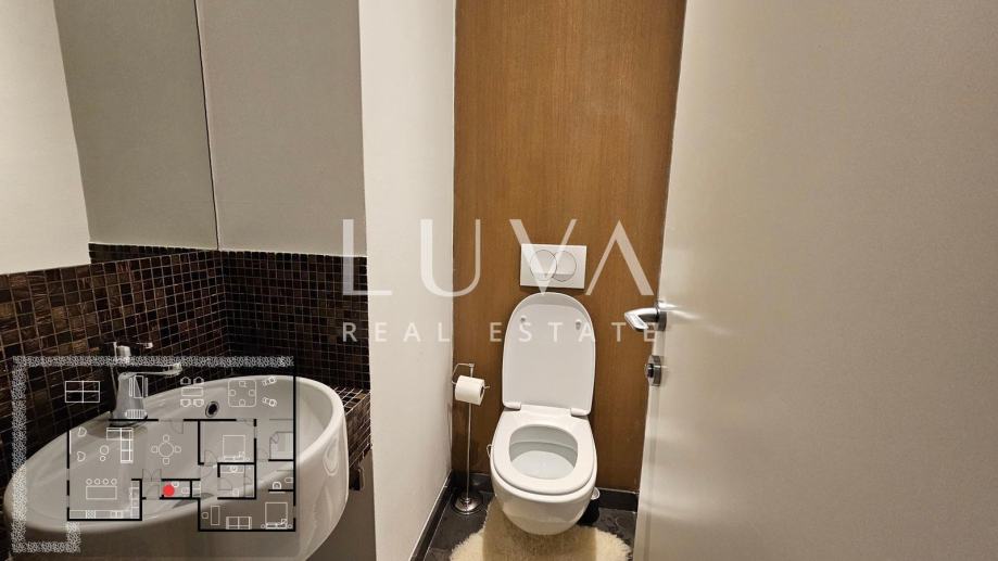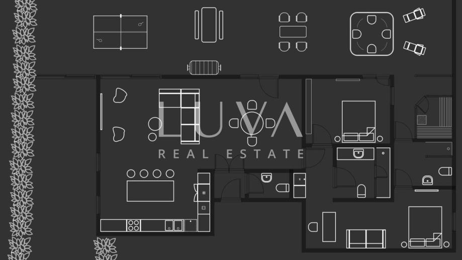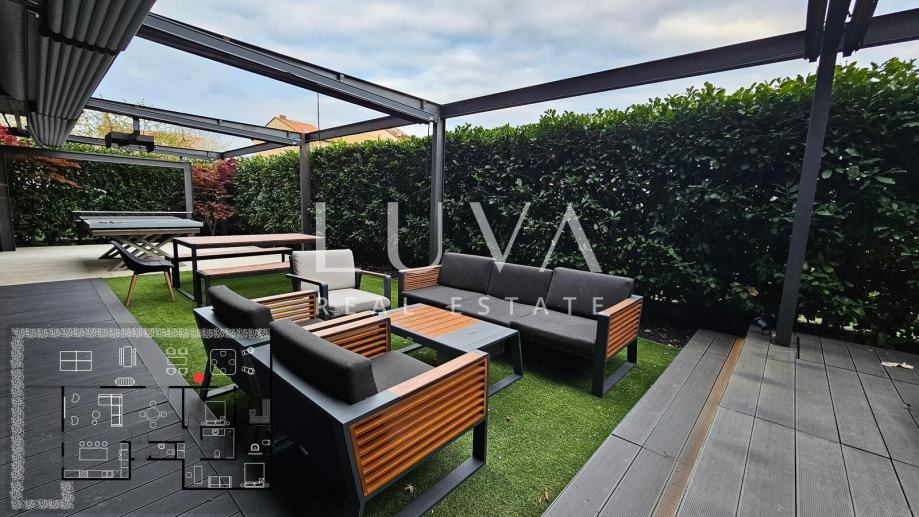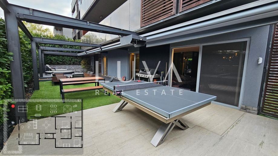 Stan se sastoji od prostranog dnevnog boravka s izlazom na veliku terasu, kuhinje s otokom i blagovaonice, dvije kupaonice te dodatnog toaleta za goste. Posebnost ove nekretnine je prostrana terasa od 100 m² koja predstavlja pravu privatnu oazu, potpuno natkrivena elektronskom tendom i zaštićena zelenilom koje pruža mir i intimu, opremljena jacuzzijem, saunom, stolom za stolni tenis te roštiljem, idealna je za opuštanje i druženje u svako doba godine.