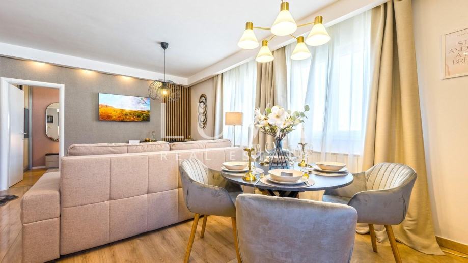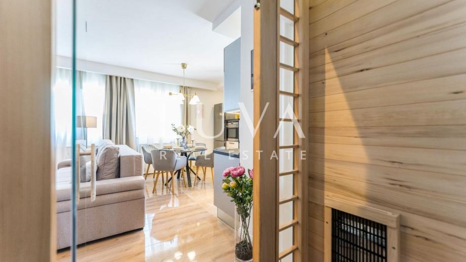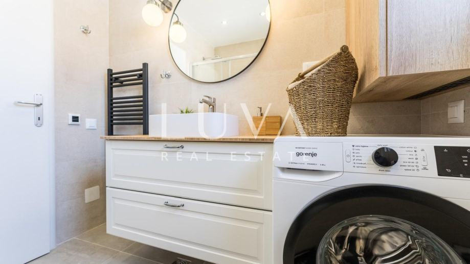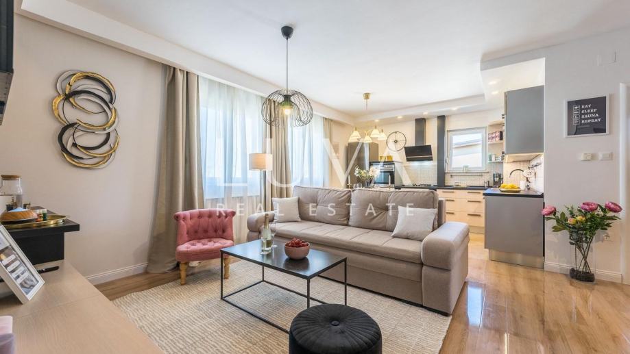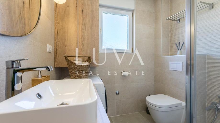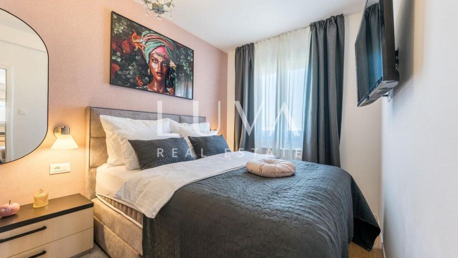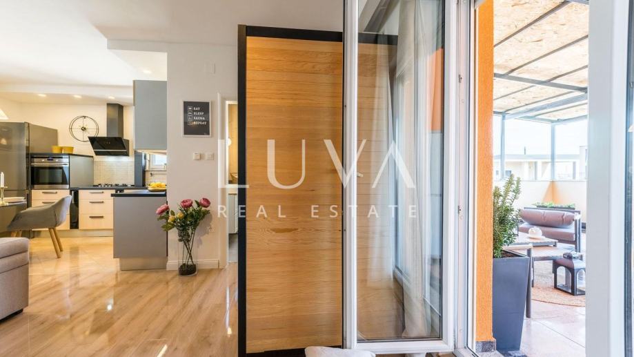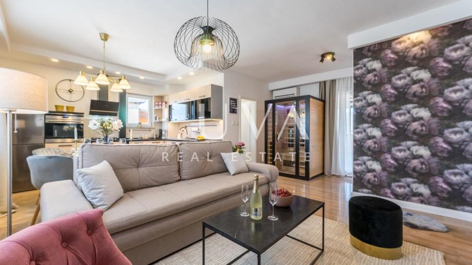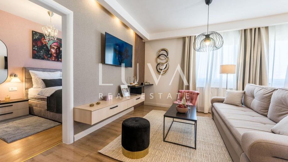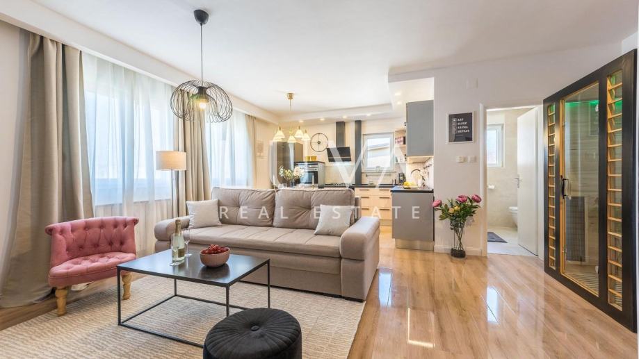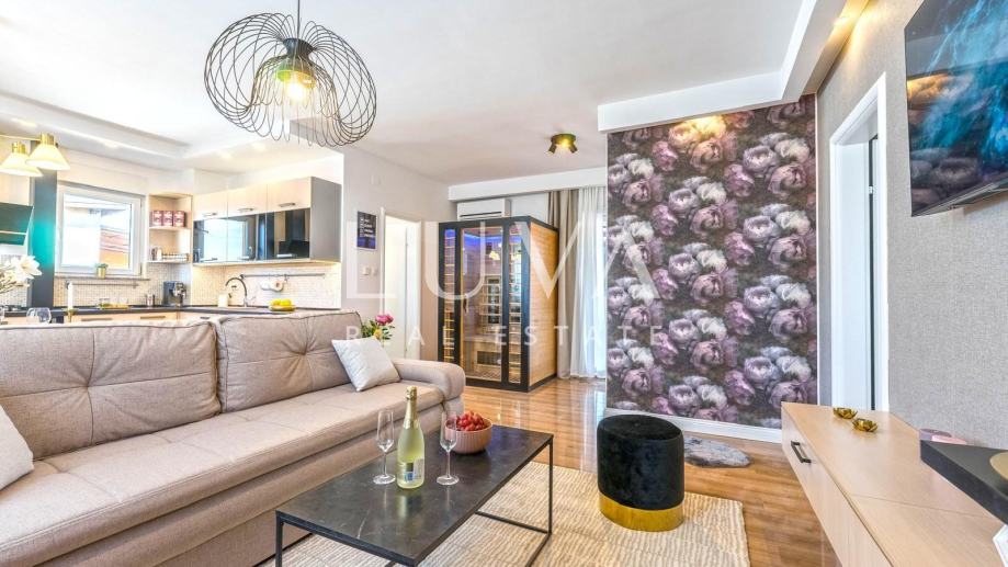 Stan je luksuzno namješten a sastoji se od prostranog open space dnevnog boravka i kuhinje, kupaonice, spavaće sobe i velike natkrivene terase koja se se s dodatnom investicijom može zatvoriti.
