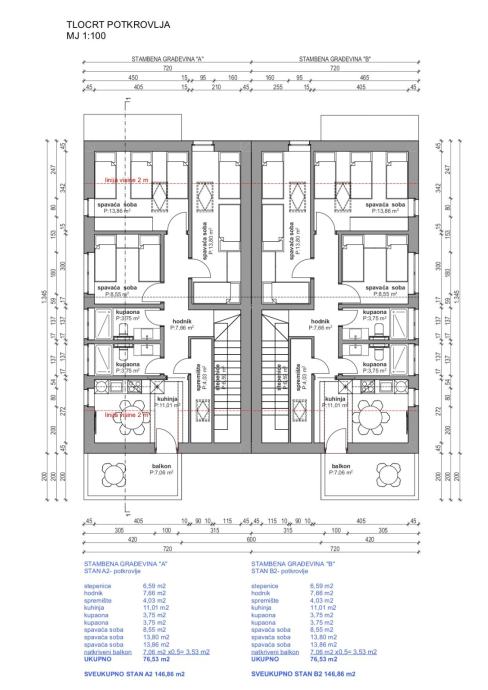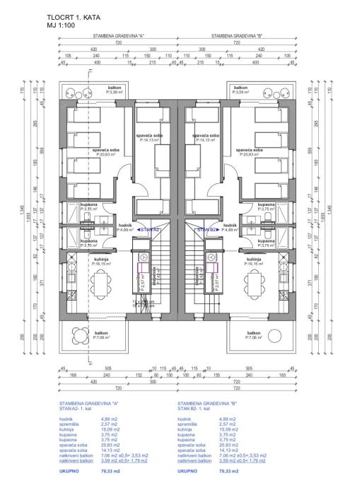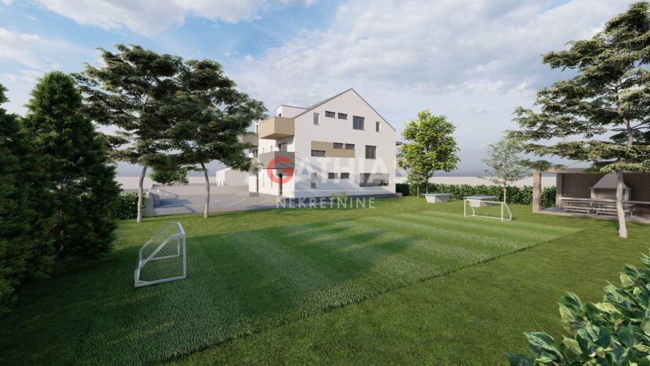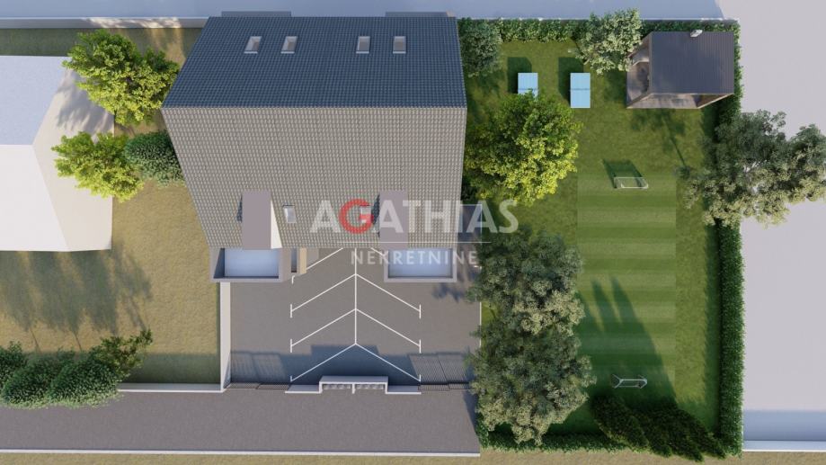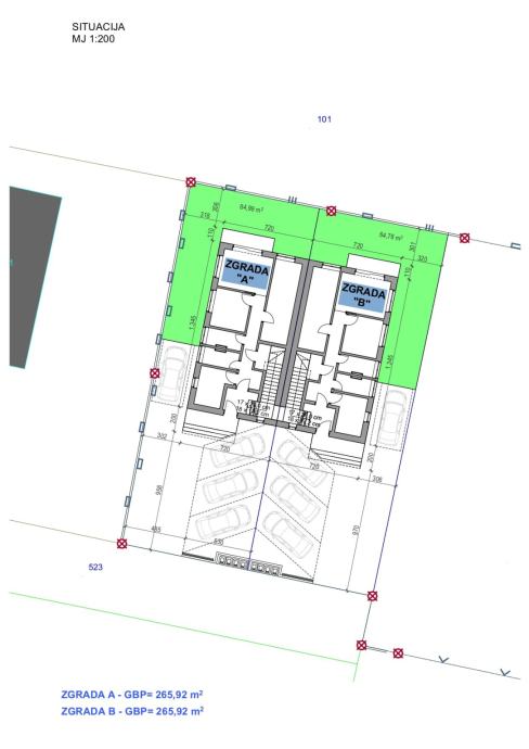 Za zemljište postoji gotov projekt kojim je predviđena parcelacija terena i izgradnja dvije poluugrađene stambene zgrade. Svaka zgrada predviđa po dva stana – jedan u prizemlju i jedan dvoetažni na katu i potkrovlju – ukupne površine 423 m2. Ovakav raspored omogućuje funkcionalno stanovanje uz visoku iskoristivost prostora, a projekt je prikladan za obiteljski život, ali i za tržišnu prodaju ili najam.