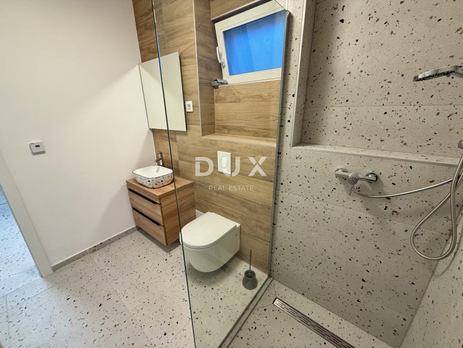 PVC stolarija u antracit boji s troslojnim staklima, električnim roletama i komarnicima pruža dodatnu izolaciju i zaštitu, dok staklene stijene podizno-kliznog sustava omogućuju izravan kontakt s vanjskim prostorom i dodatno osvjetljavaju dnevni boravak. Ulazna vrata su protuprovalna i protupožarna, a unutarnja drvena vrata imaju magnetne brave i skrivene pante, što dodatno doprinosi estetici i sigurnosti prostora.