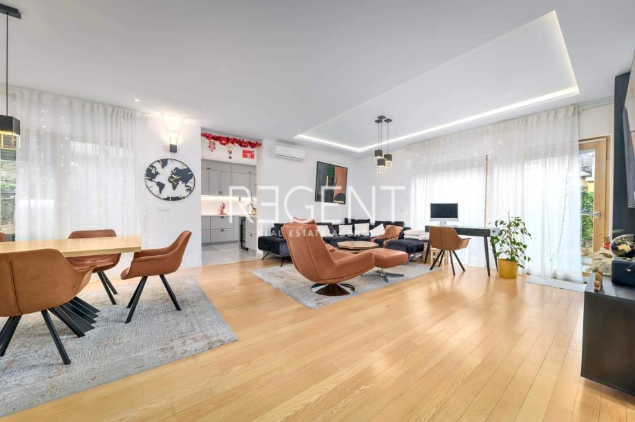 Na Babonićevoj ulici na Šalati, jednoj od najatraktivnijih gradskih lokacija u Zagrebu, u prizemlju manje stambene novogradnje nalazi se četverosoban stan koji će zadovoljiti i najzahtjevnije potrebe za udobnim i elegantnim domom. Ukupna površina stana iznosi 167 m2, od čega je 100 m2 zatvorene stambene površine, dok se ostatak prostire na pripadajući vrt od 102 m2 i natkrivenu terasu površine 11,51 m2.