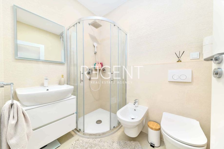 Stan je pažljivo uređen s lijepim detaljima koji pružaju visokokvalitetni životni prostor. Sastoji se od dva hodnika, gostinjskog toaleta, dvije kupaonice, te tri prostrane spavaće sobe koje nude udobnost i privatnost. Dnevni boravak s otvorenom kuhinjom i blagovaonicom stvara prostor idealan za druženje i opuštanje, dok praktično spremište i garaža osiguravaju dovoljno prostora za odlaganje stvari i parking vozila.