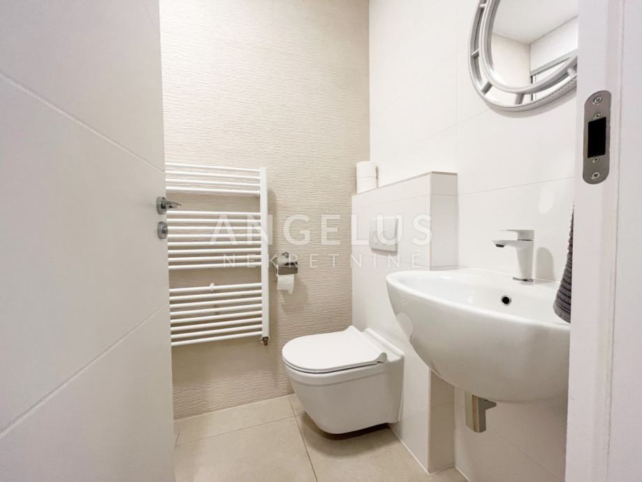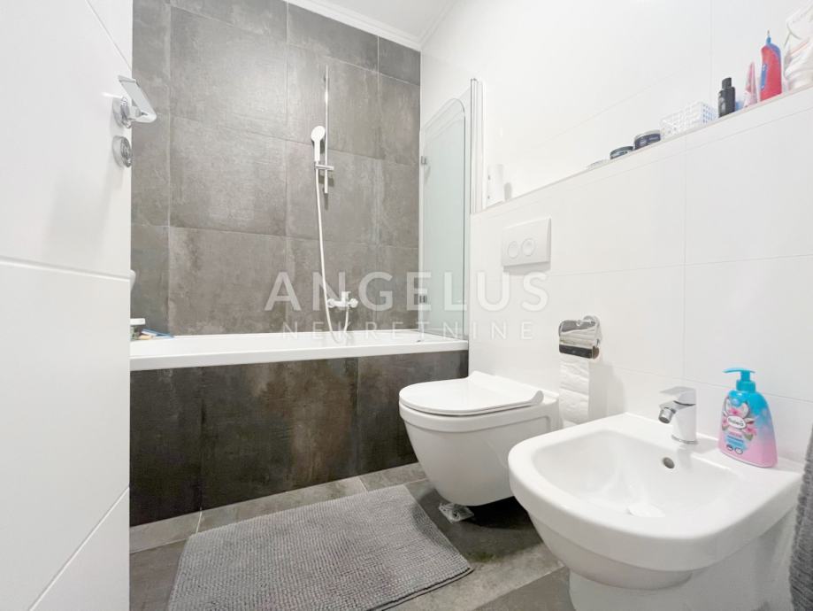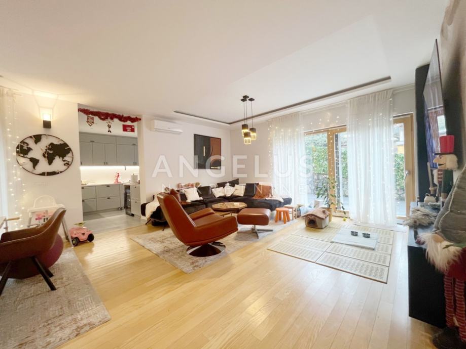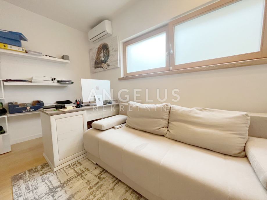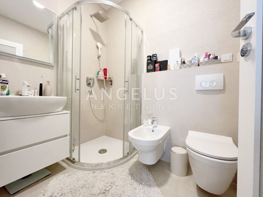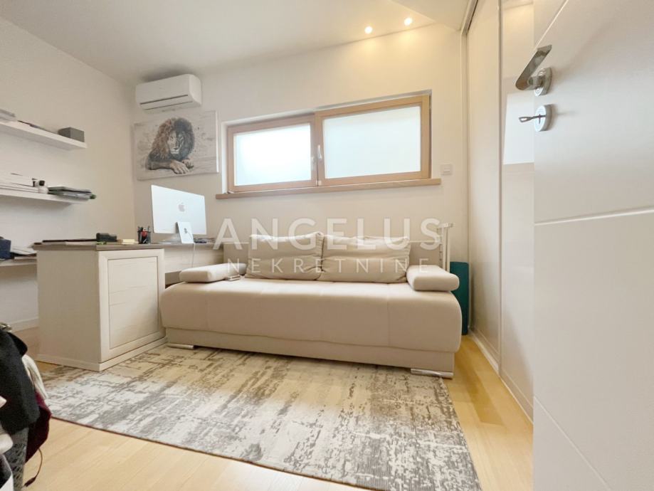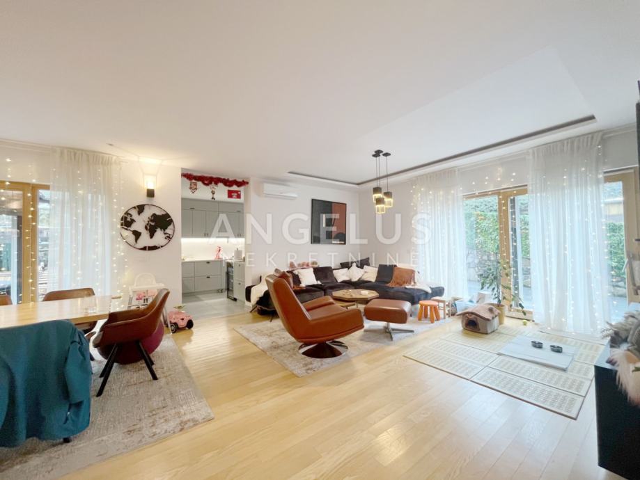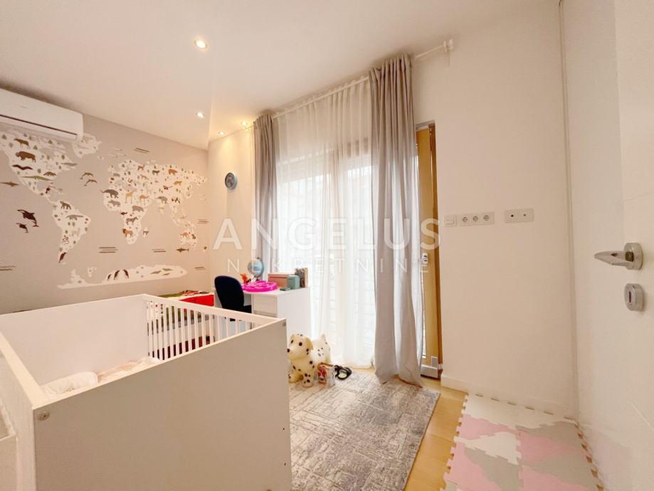 Stan se nalazi u prizemlju zgrade sa 2 kata sa liftom, a sastoji se od: ulaznog hodnika, 3 spavaće sobe, 2 terase (14.12 m2,33.11 m2 i 11.51 m2), 2 kupaonice, toaleta, odvojene kuhinje, dnevnog boravka sa izlazom na sjeverni (22,33 m2 i 4,60 m2) i zapadni vrt (27,90 m2) . U slučaju potrebe moguće je napraviti četvrtu spavaću sobu, te kuhinju postaviti na mjesto trenutne blagovaonice gdje su već provedene instalacije. Stan se prodaje opremljen kuhinjom i ugradbenim ormarima, a pripada mu garaža (23,46 m2) i spremište u podrumu. Zgrada je završena 2019.godine. Plinsko centralno grijanje, klimatizirano stolarija drvo-aluminij.