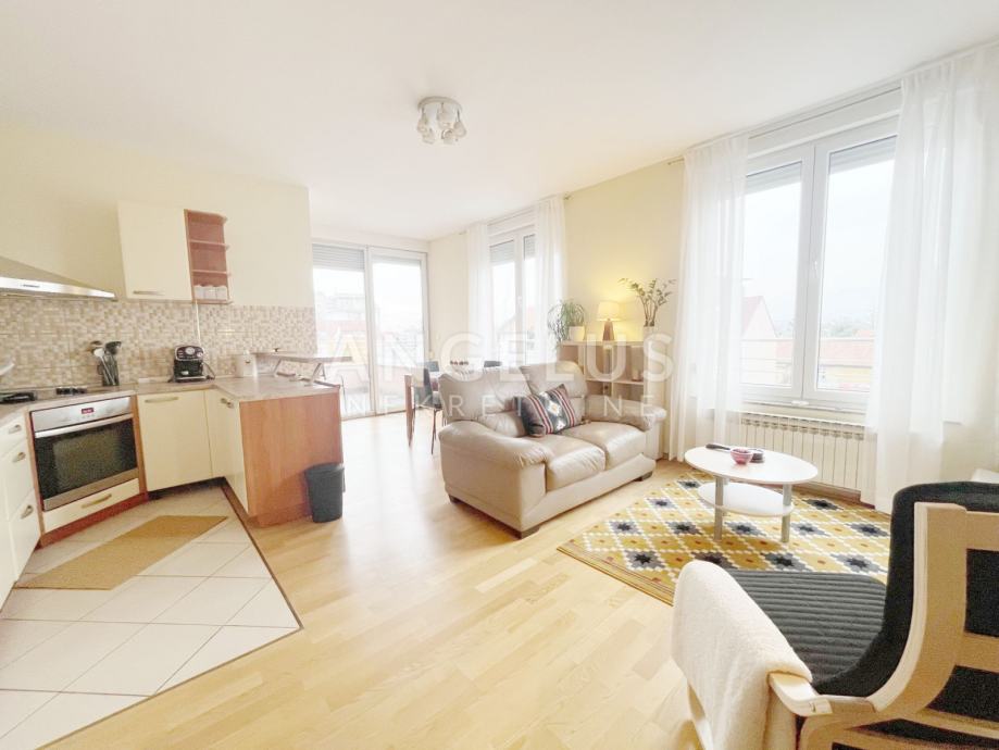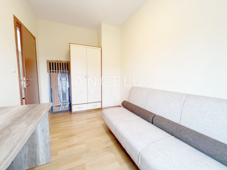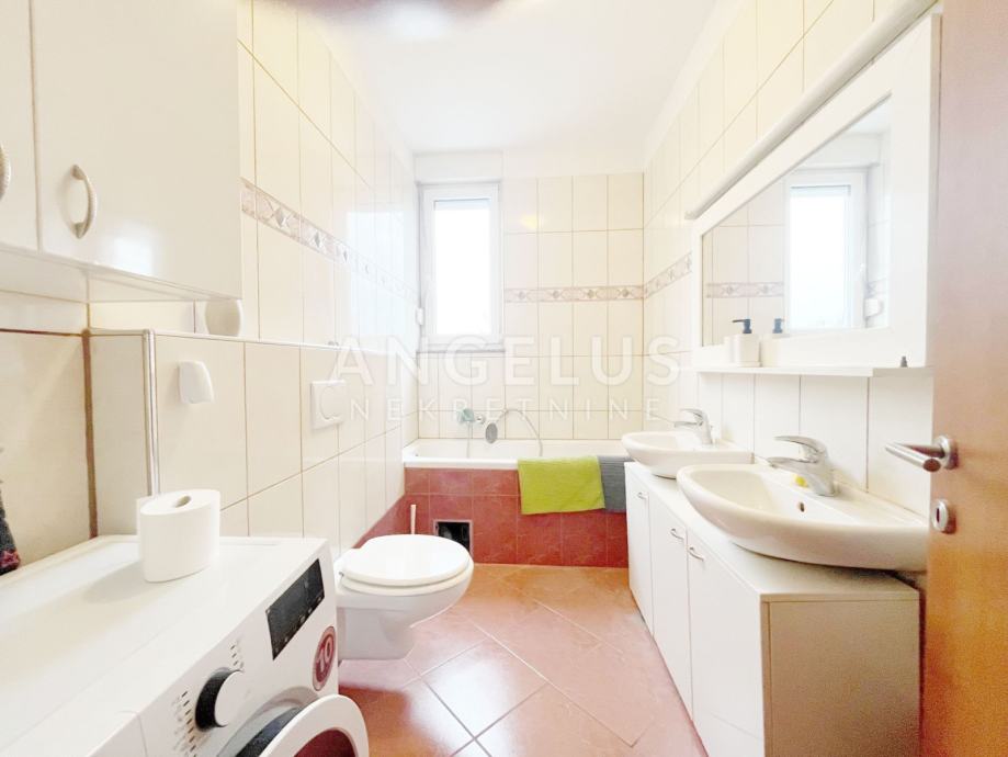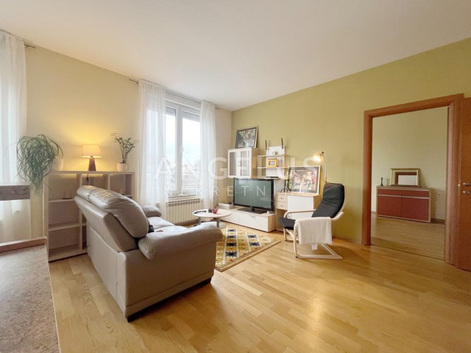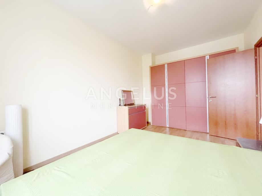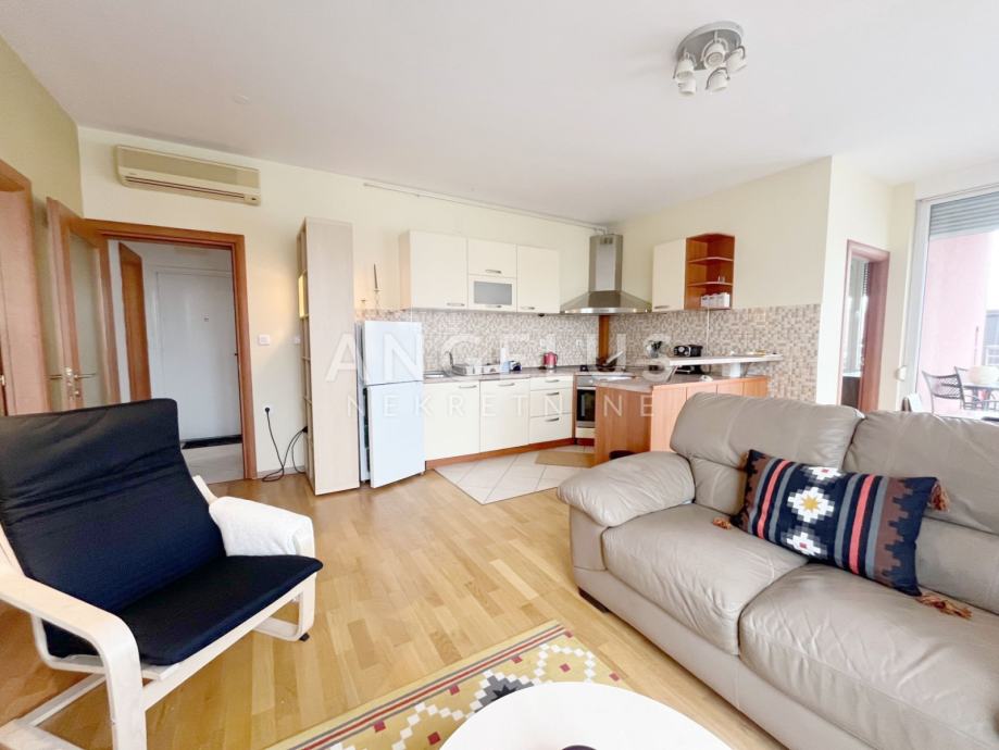 Namješteni stan površine 77 m2, nalazi se na drugom katu novije zgrade sa liftom, a sastoji se od: ulaznog hodnika, 2 spavaće sobe, kupaonice i kuhinje povezane sa dnevnim boravkom i izlazom na balkon Namješten je, plinsko centralno grijanje. Pripada mu prostrana garaža.