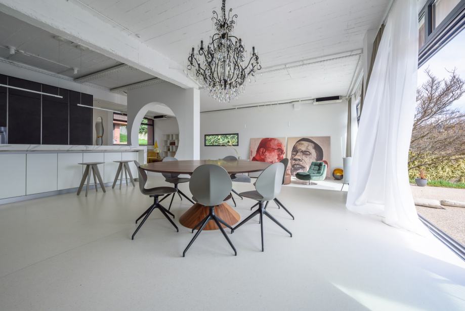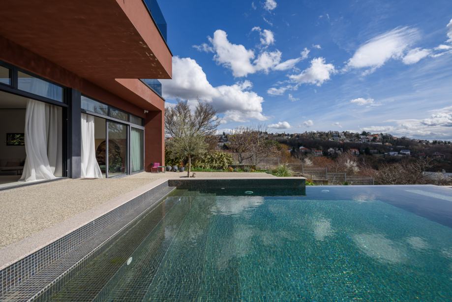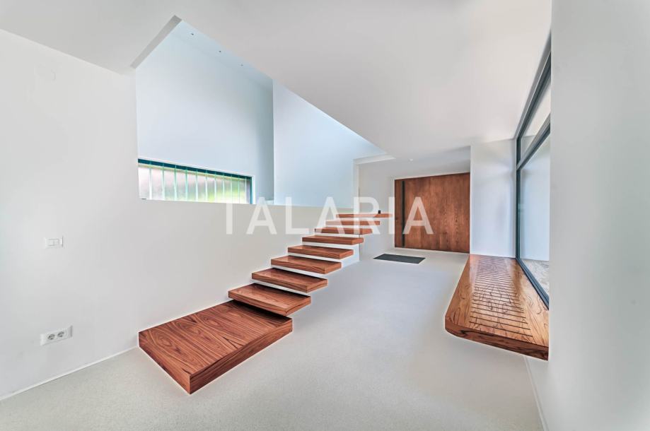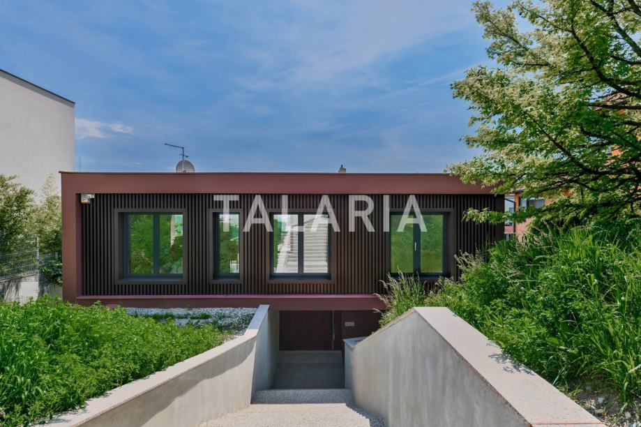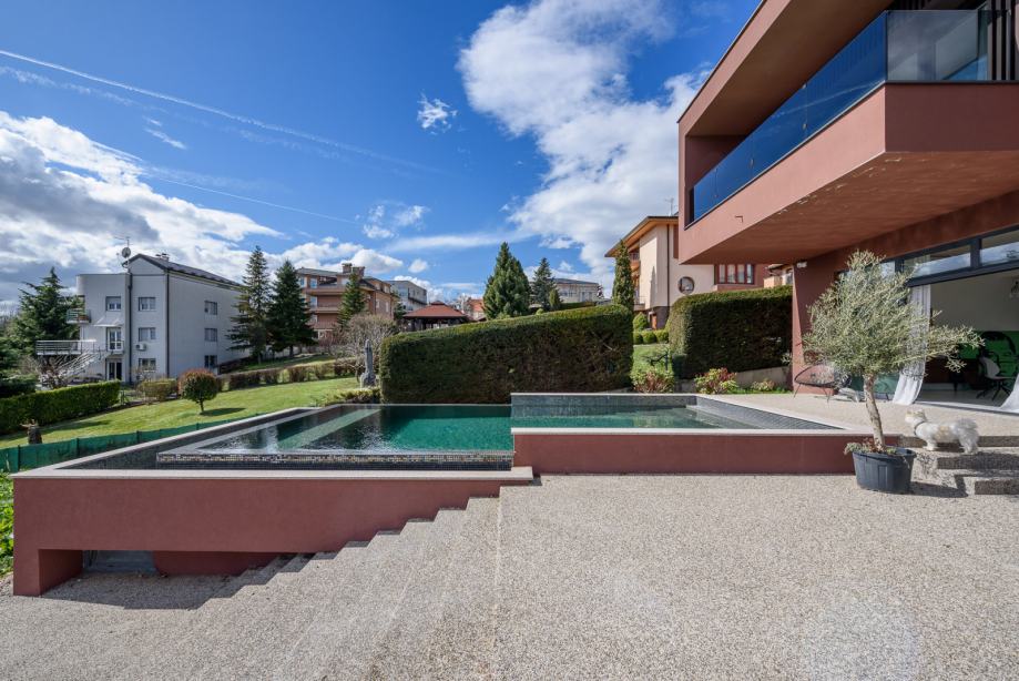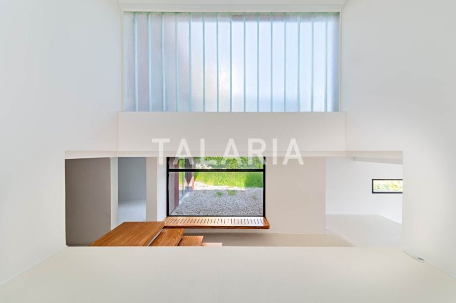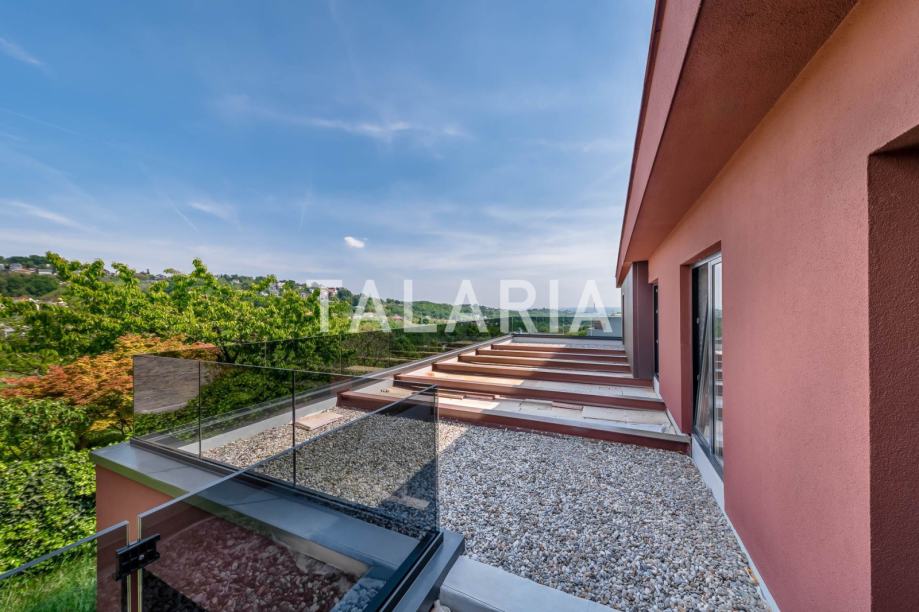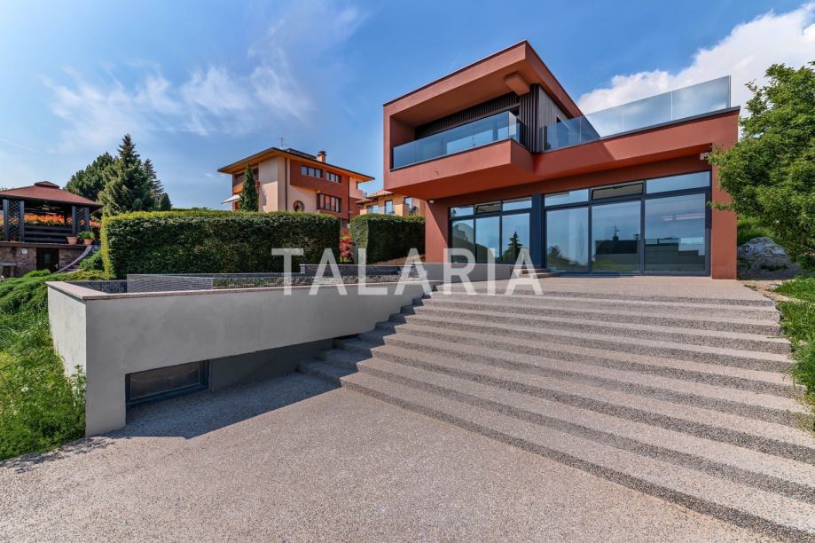 Iznajmljuje se iznimna, moderna vila od 378 m2 (bruto 575m2), na mirnim obroncima Šestina, dominantne južne orijentacije, širokog i otvorenog pogleda na grad, na parceli od 1532 m2. Građena je 2006 godine a temeljito adaptirana 2023.godine. Nalazi se u mirnoj ulici s lijepim obiteljskim vilama na velikim parcelama. Vila je razvedena samo na dva nivoa i nema podrumskih prostorija već se vinoteka, drvarnica i alatnica nalaze u razini prizemlja s vanjskim pristupom. Na prizemlju je raskošan ulazni hol opločen bijelim kulirom (terrazom) koji vodi prema izuzetno prostranom dnevnom boravku, blagavaoni i kuhinji (open plan od impozantnih 126 m2) otvorenim prema jugu staklenim stijenama. Boravak se nastavlja prema natkrivenoj terasi (38 m2), bazenu (41m2) te blago padajućem vrtu. Iza kuhinje postoji servisna soba/kuhinja sa posebnim izlazom/ulazom izvana. Ova prostorija omogućava jednostavnu dostavu cateringa ili pripremanje hrane za veći broj ljudi ( pogodno za rezidencije) ili može služiti kao soba za domaćicu. Na ovoj etaži nalazi se gostinjski apartman sa izlazom na mali privatni dio vrta ( soba, garderoba i veća kupaona) te gostinjski WC. Iz hola se konzolnim stepenicama dolazi do otvorene atraktivne i estetski dopadljive galerije sa lijevim i desnim spavaćim traktom. U lijevoj strani nalazi se master spavaći dio sa garderobom i kupaonicom sa prekrasnim svjetlarnikom (kada,tuš) te izlazom na terasu. Drugi (suprotni) trakt galerije vodi do dječjeg dijela kuće kojeg čini prostran dječji spavaći apartman koji je moguće podijeliti na 2 spavaće sobe i kupaonicu.