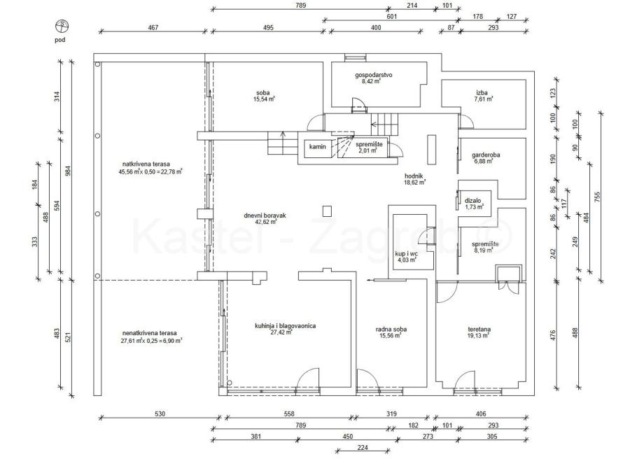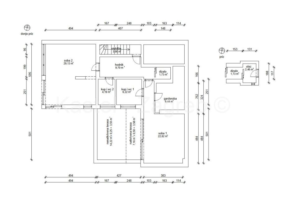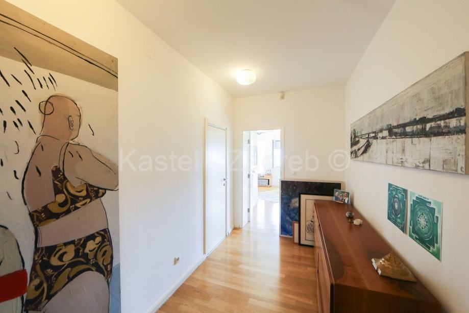 Stan se prostire na dvije etaže koje su povezane dizalom i stepeništem. Na gornjoj etaži nalazi se ulazni hodnik, spavaća soba, kupaonica, glavna soba s kupaonicom, garderobom i izlazom na polunatkrivenu terasu 21m2, stubište koje se spuštana donju etažu u sklopu koje se nalazi prostrani dnevni boravak, kuhinja s blagovaonicom iz koje se nalazi izlazi na polunatkrivenu terasu 73m2 i vrt , soba, radna soba, teretana sa saunom, gospodarstvo, spremište, izba i kupaonica. Sve prostorije imaju izlaz na vrt.