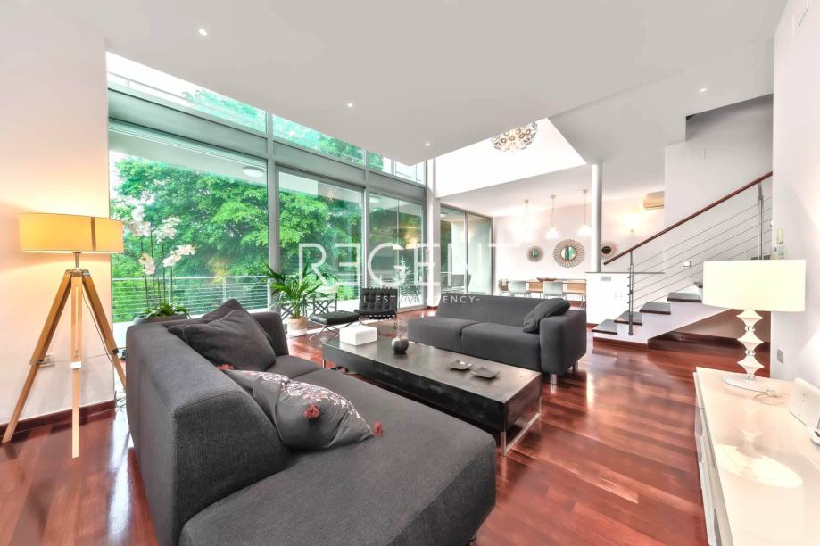 Ova prekrasna moderna kuća ima stambenu površinu od približno 380 četvornih metara + podrum od 50 četvornih metara, raspoređen na 3 etaže – suteren, prizemlje i kat.
