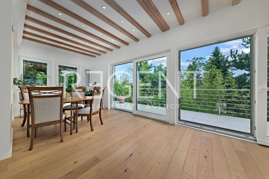Luksuzna moderna vila s bazenom smjestila se na mirnoj privatnoj lokaciji s predivnim pogledom na Sljeme i zelenilo, u Šestinama u Kulmerskoj ulici nedaleko od strogog centra grada. Kuća je zatvorene površine od 309,49 m2 s bazenom na prostranom zemljištu površine 1322 m2.Izgrađena 1995. godine po najvišim građevinskim standardima, a 2019. godine potpuno renovirana.Većina zemljišta cca 1080 m2 se nalazi u građevinskoj, stambenoj zoni S urbana pravila 2.2, a ostatak u zoni Z2 urbana pravila 2.2.Kuća se sastoji od tri etaže:Suteren 89,39 m2 : kotlovnica, spremište, bazenska tehnika, potpuno namještena i opremljena garsonijera.Prizemlje 123,87 m2 : ulazni prostor, stepenište, toalet, garderoba, kuhinja, dnevni boravak i blagovaonica otvorenog tlocrta s izlazom na terasu 12,20 m2.1.kat 96,23 m2 : hodnik, master soba s kupaonicom, 3 spavaće sobe, kupaonica i garderoba. Postoji mogućnost parkiranja više vozila u dvorištu. Vanjski preljevni bazen 34 m2 s protustrujnim plivanjem i automatskim doziranjem.Interijer kuće opremljen je luksuznim i dizajnerskim namještajem, dostupnost svjetlosti svih prostorija doprinosi orijentacija na sve četiri strane svijeta, dok se eksterijer kuće sastoji od prekrasno uređene okućnice i vrta s automatskim navodnjavanjem, te bazenom s kojeg se pruža predivan pogled na zelenilo i grad, kuća je zaklonjena od susjednih nekretnina te pruža potpunu privatnost.Lokacija kuće se nalazi u neposrednoj blizini Pantovčaka, privatne osnovne škole i svih bitnih sadržaja.Za više informacija, kontaktirajte našeg agenta na brojeve telefona: