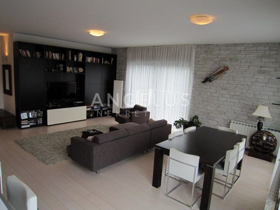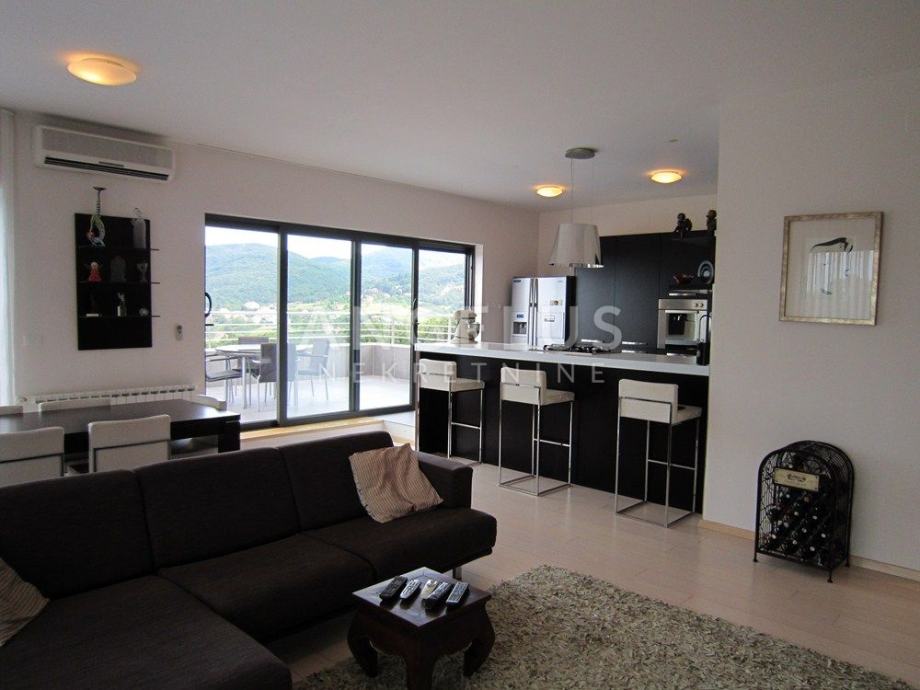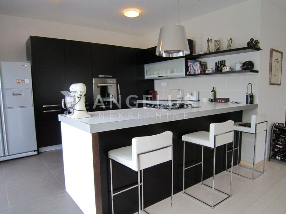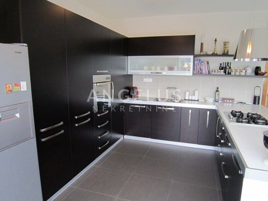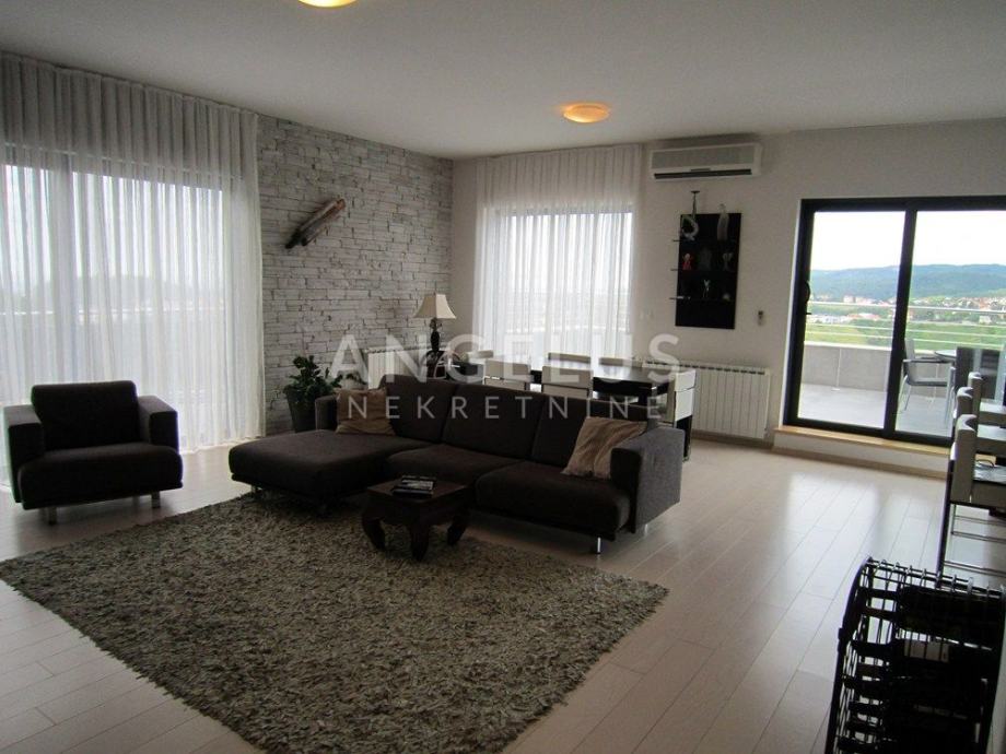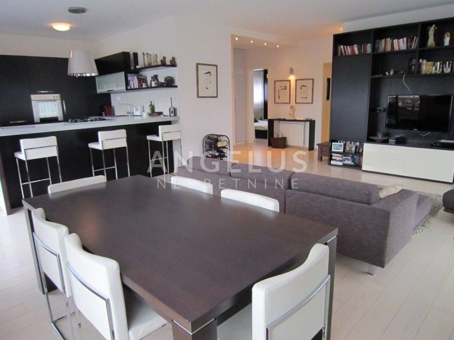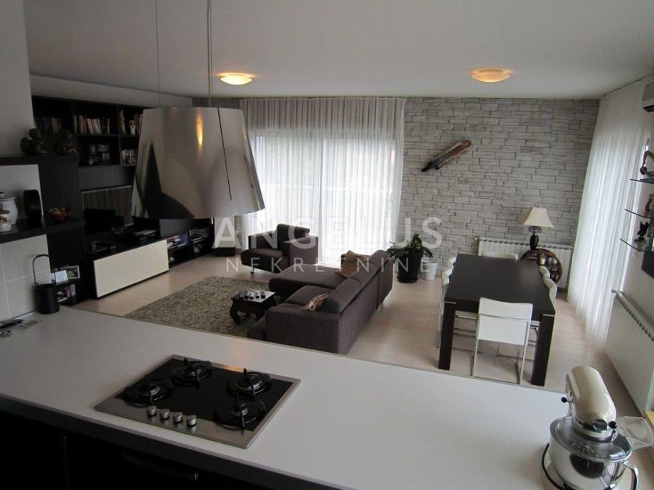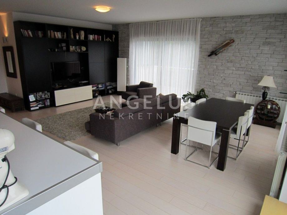 Vrlo lijepi noviji stan stambene površine 130 m2, nalazi se na 2. ( zadnjem) katu novije zgrade sa liftom. Sastoji se od ulaznog prostora, 3 spavaće sobe, kupaonice, toaleta, spremišta, kuhinje sa blagovaonicom i dnevnog boravka, dvije terase i balkona. Pripadaju mu 2 parkirna mjesta i ima mogućnost korištenja unutarnjeg bazena u prizemlju zgrade.