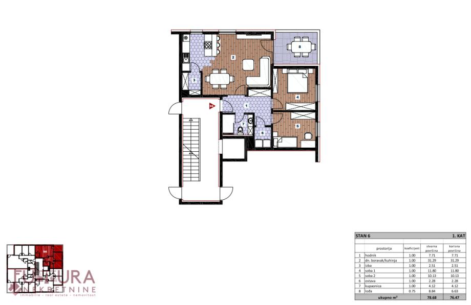 Zagreb - Sesvete (Gajišće), prodaje se stan od 76,47 m2 na prvom katu stambene zgrade u izgradnji, planirani rok useljenja je kraj 2026. godine.