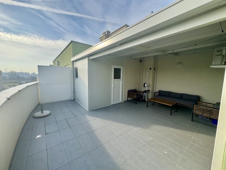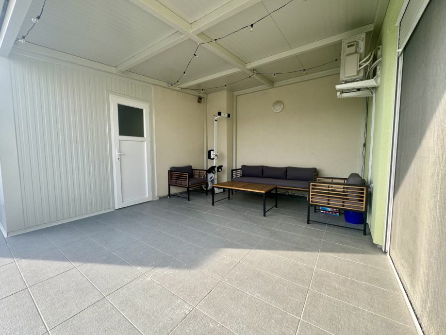 • Terasa: 41,59 m² (uređena, djelomično natkrivena; dio zatvoren kao spremište)