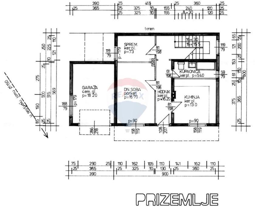 U prizemlju se nalaze kuhinja/blagavaona, dnevni boravak, kupaonica i 2 spremišta.