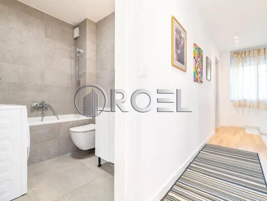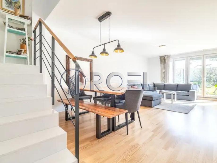 Sastoji se od ulaznog hodnika, kuhinje i blagovaonice s prostranim dnevnim boravkom koji ima izlaz na vrt, te toaleta, na donjoj etaži. Na gornjoj etaži nalaze se tri spavaće sobe i dvije kupaonice s toaletom.Stanu pripada spremište u u podrumu i vanjsko parking mjesto koje vodi izravno u sam stan.