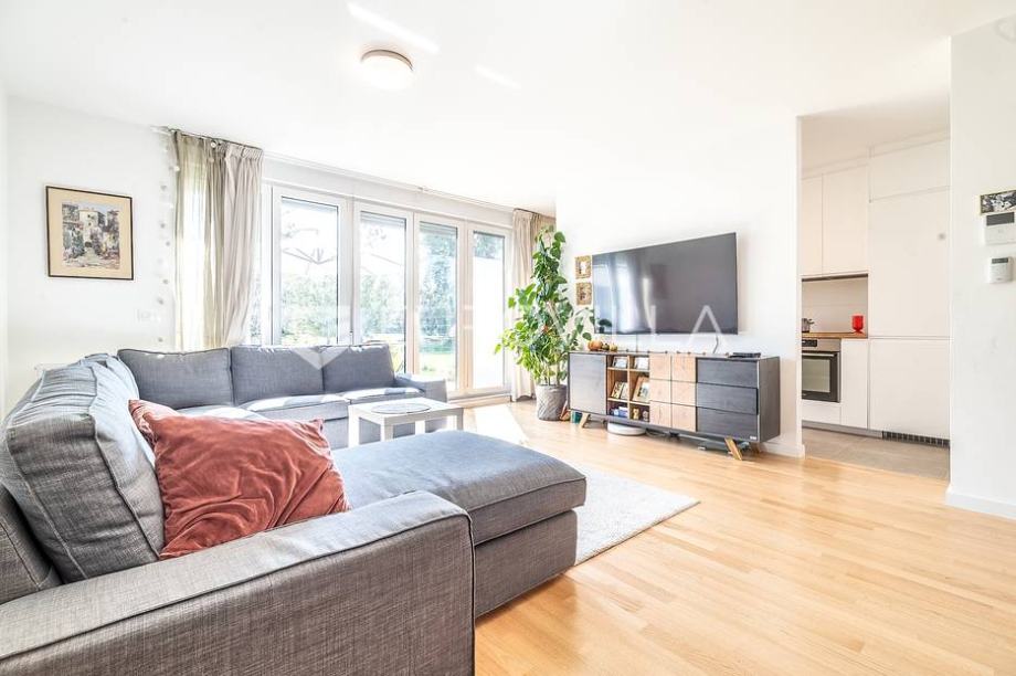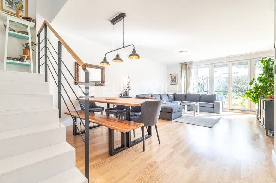 Novi Zagreb, Siget, furnished four-room apartment on two floors with a total area of 114 m2. It consists of an entrance hall, kitchen and dining room with a spacious living room opening onto the garden, and a toilet on the lower floor. On the upper floor there are three bedrooms, 2 bathroom with a...