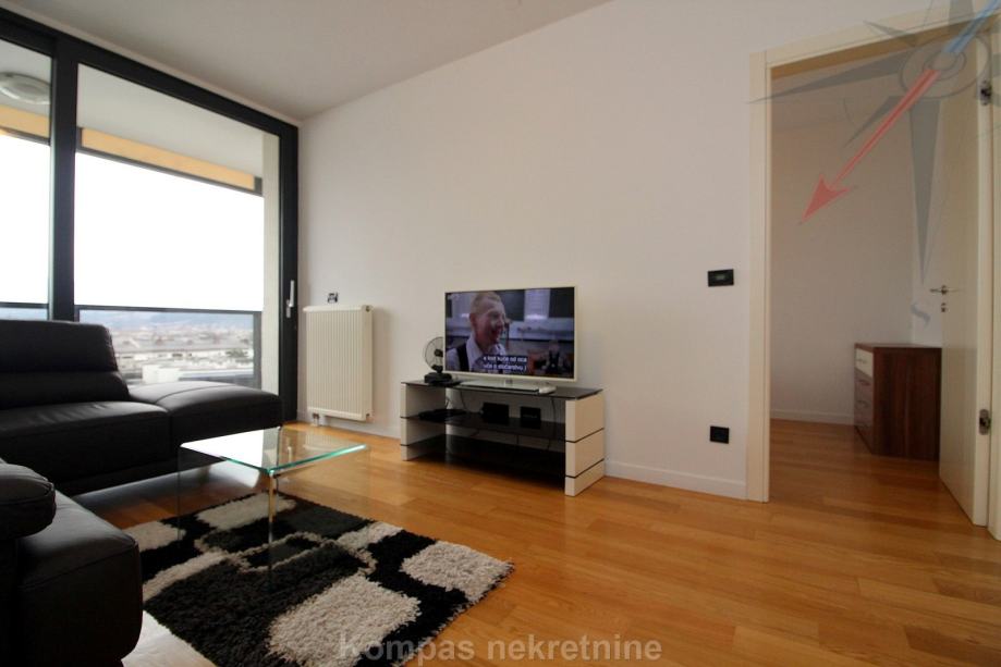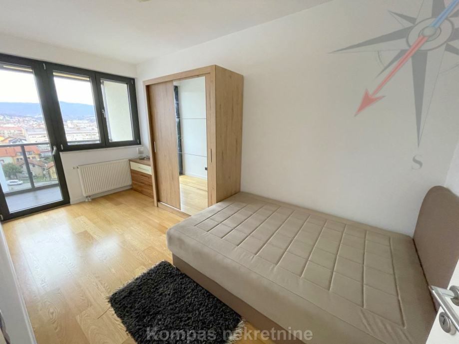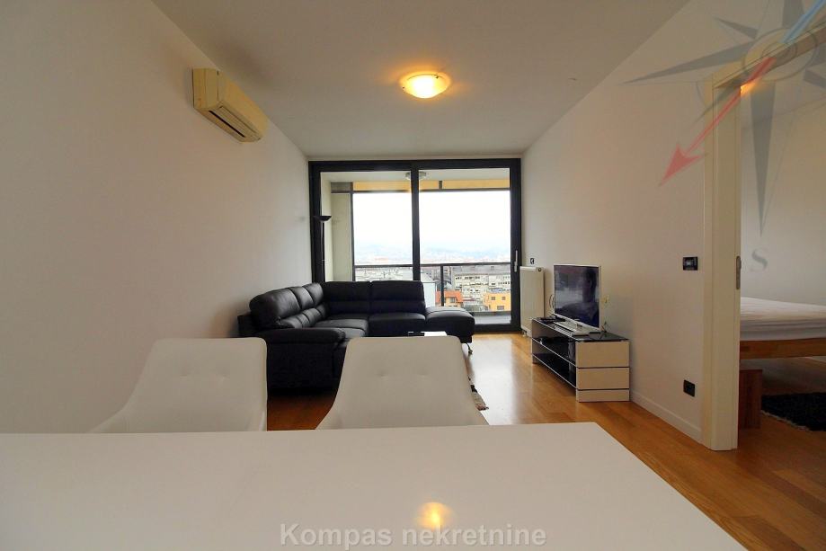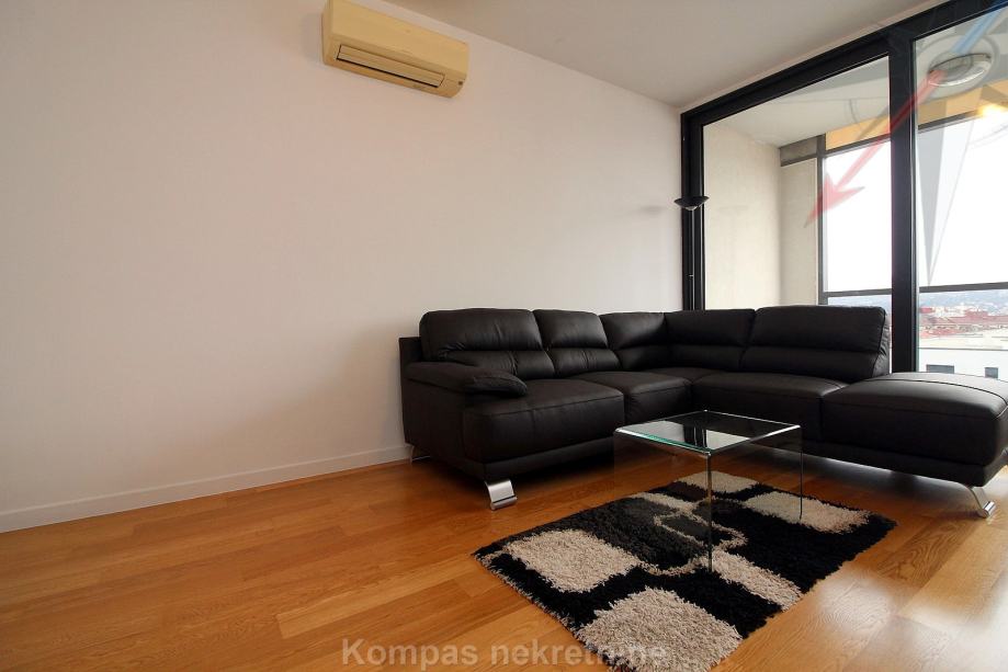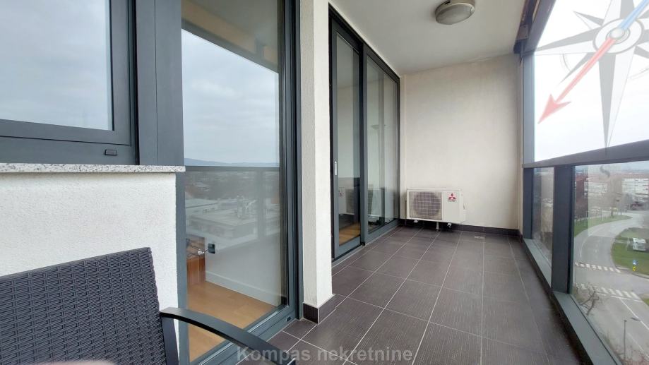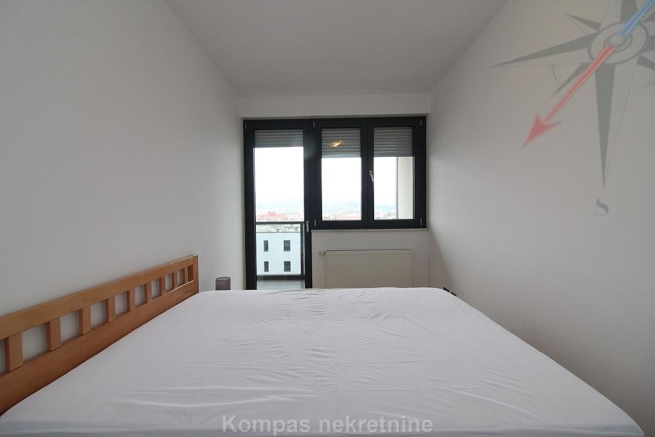 Renovated, furnished three-room apartment (68 m2) on the sixth floor of a residential and commercial building, Nova galerija, Špansko. Consists of an entrance area, living room, two bedrooms, kitchen, bathroom, loggia. It has security door, air conditioning, central gas heating, optical internet. The bedrooms will be furnished according to the tenant's needs. The apartment has a storage room and one parking space in the garage on the -3rd floor of the building. The building has a freight and passenger elevator. Pets are not allowed. The building reserve for the apartment is 40 euros. Located near bus and tram lines, shopping centers, restaurants. The owner is asking for a minimum two-year lease and two deposits.