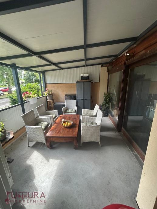 Stan se sastoji od ulaznog prostora, garderobe, radne sobe, spavaće sobe, kuhinje s blagovaonicom te dnevnog boravka iz kojeg se izlazi na natkrivenu terasu i vrt. Zgrada je izgrađena 1995. godine.